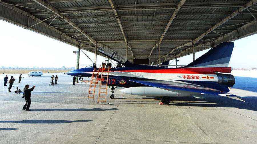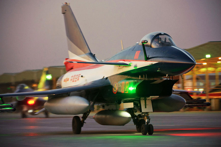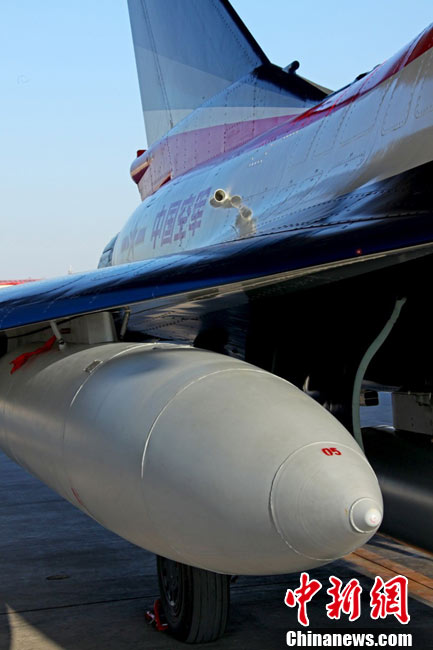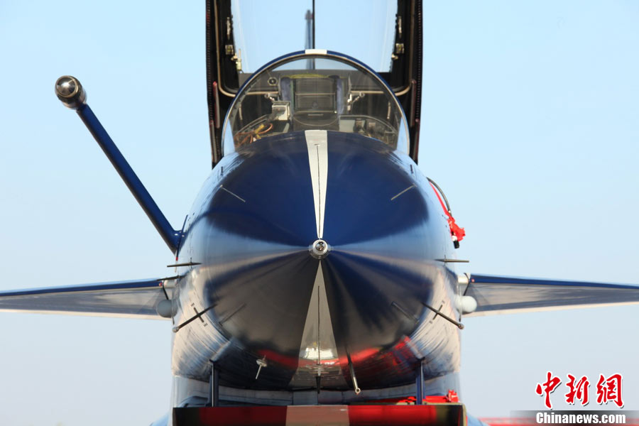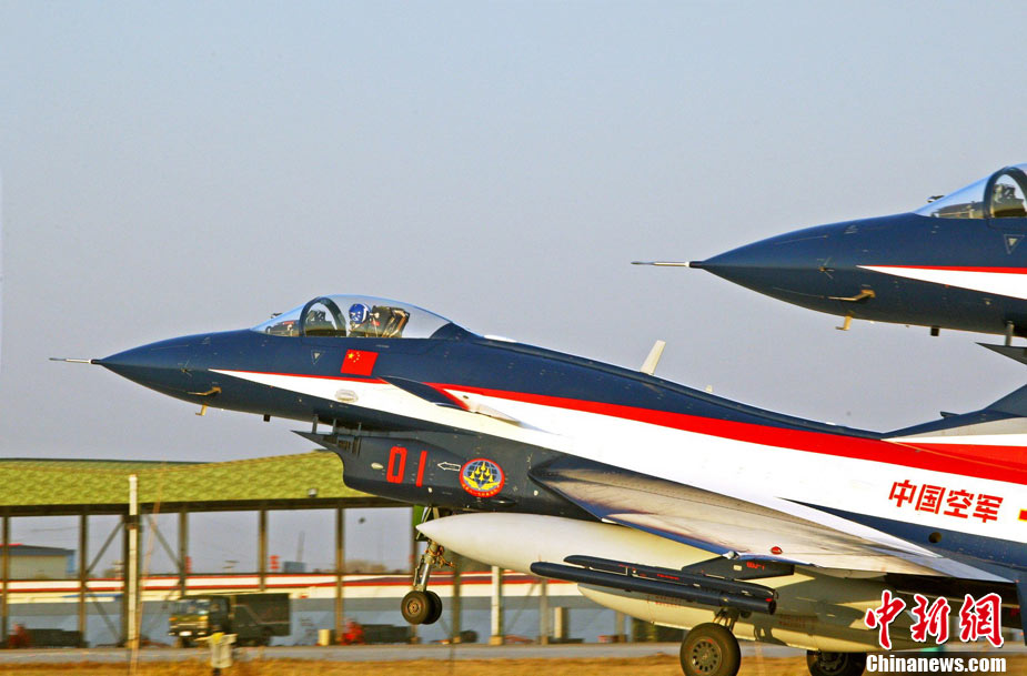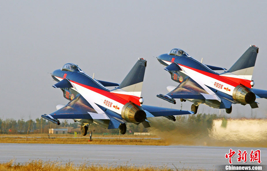 11月初,中國空軍八一飛行表演隊新涂裝的殲10飛機雙機起飛?哲姲艘伙w行表演隊7架殲—10戰(zhàn)機近日將飛赴珠海,參加11月16日至21日舉行的第8屆中國國際航空航天博覽會(珠海航展)。這是表演隊換裝殲—10戰(zhàn)機后,首次以新涂裝向世人正式亮相?哲娺將派出殲—8F、殲轟—7A、轟—6H、空警—200、直—8KA、直—9WA等7型飛機,參加這次國際性綜合航展。中新社發(fā) 譚超 攝