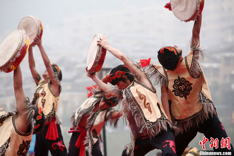 圖為汶川青年跳羊皮鼓舞歡慶羌歷年。中新社發(fā) 張浪 攝