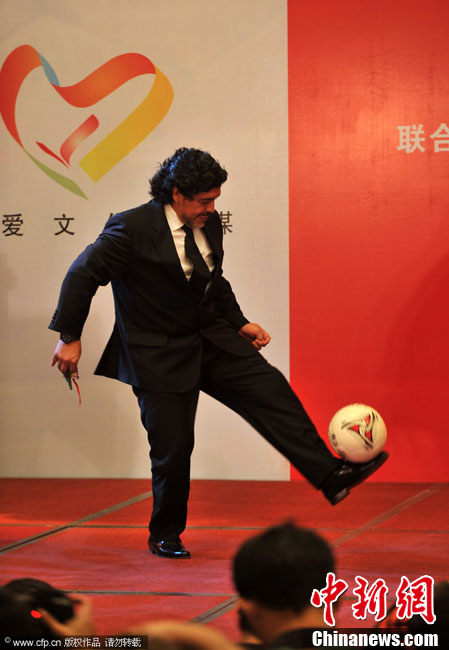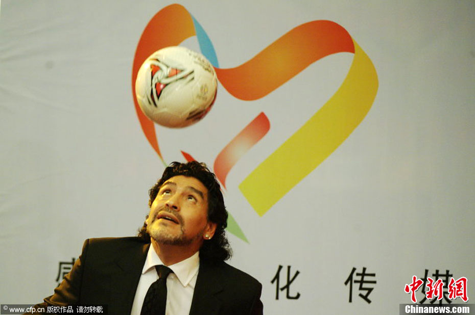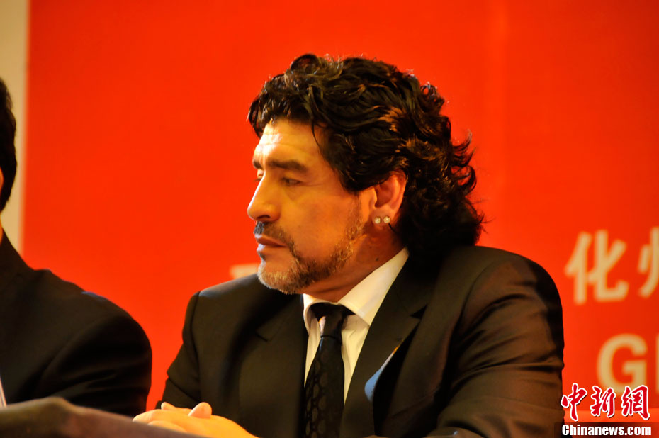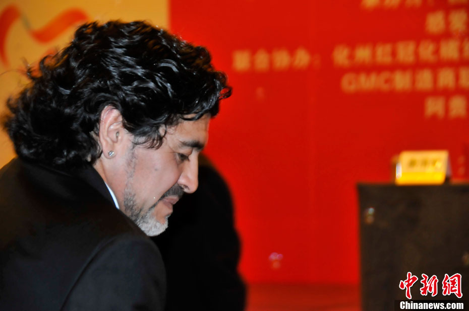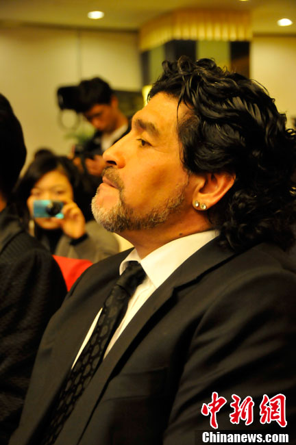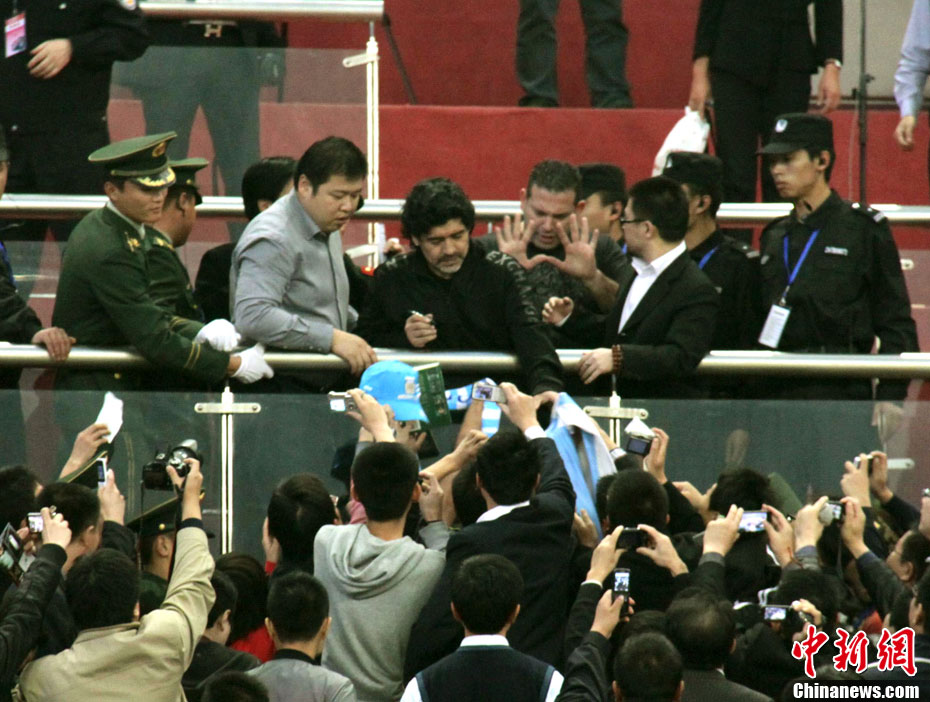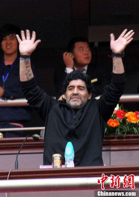 11月5日下午16時左右,世界球王馬拉多納來到山東濟(jì)南奧體中心參加山東聯(lián)隊與阿根廷明星隊的慈善比賽。圖為馬拉多納向現(xiàn)場的觀眾和球迷揮手致意。中新社發(fā) 牛杰峰 攝