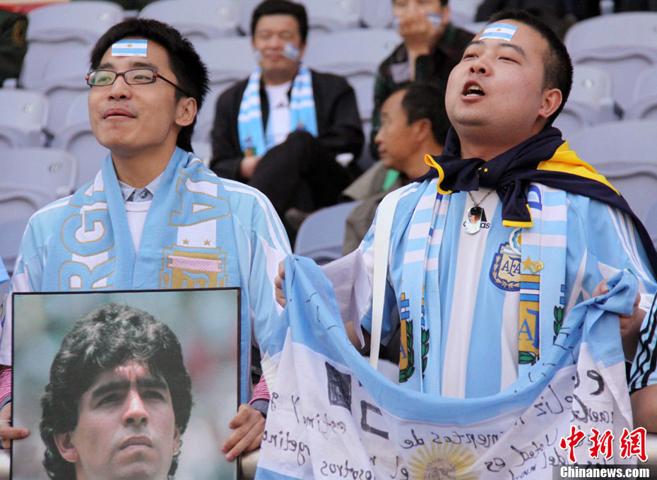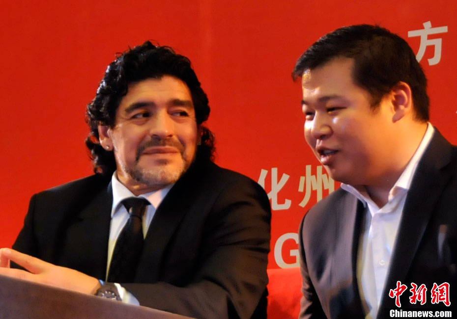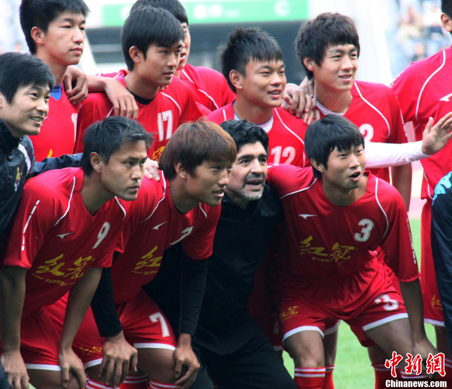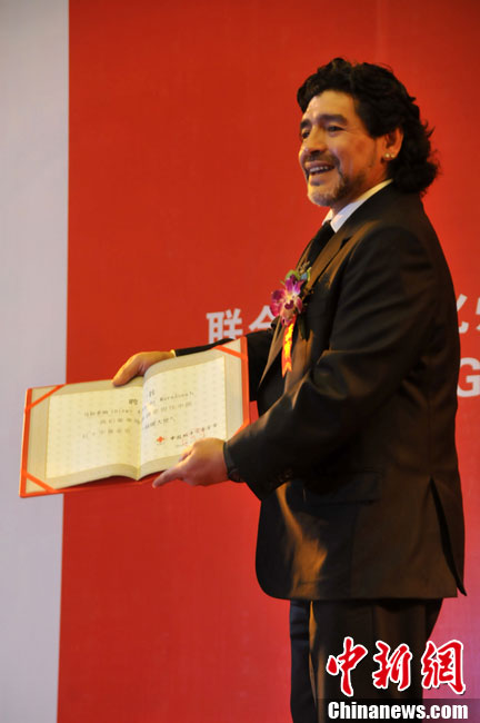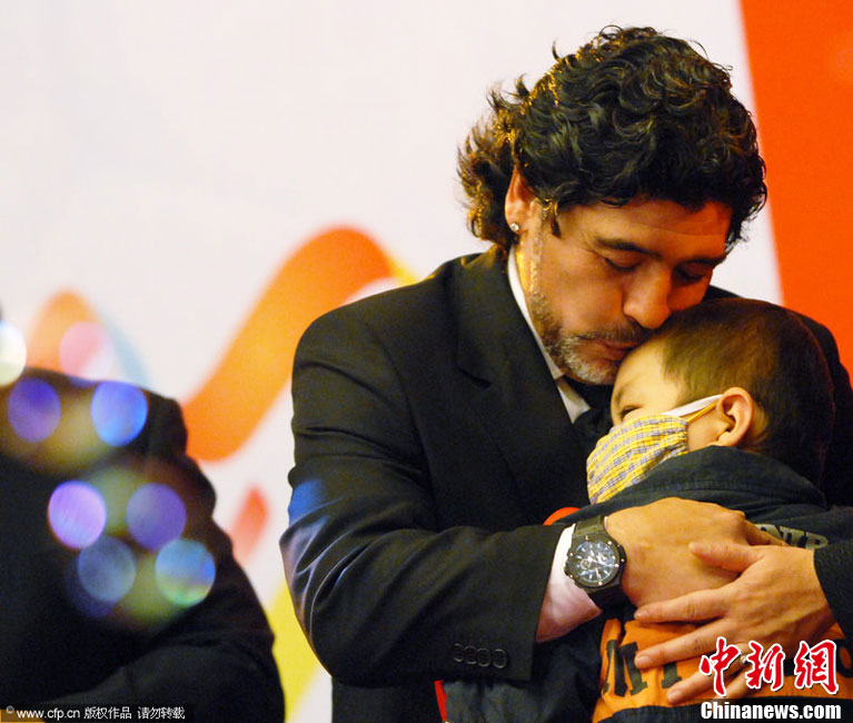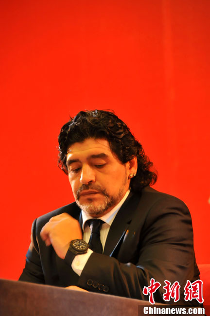 11月5日下午16時左右,世界球王馬拉多納來到山東濟(jì)南奧體中心參加山東聯(lián)隊與阿根廷明星隊的慈善比賽。圖為馬拉多納向現(xiàn)場的觀眾和球迷揮手致意。中新社發(fā) 牛杰峰 攝