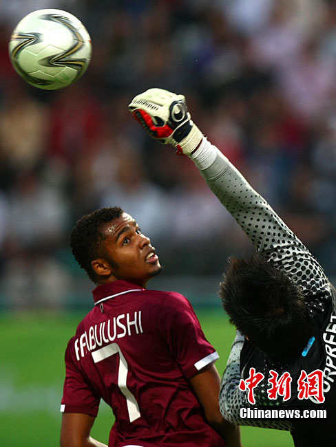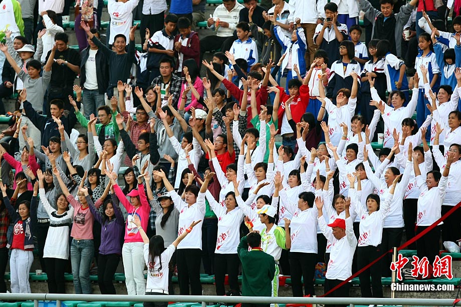 11月9日,第16屆亞運會男足比賽展開D組的一場爭奪,上屆亞運會冠軍卡塔爾隊(紅)在先失一球的情況下實現(xiàn)逆轉(zhuǎn),最終以2:1戰(zhàn)勝印度隊。圖為觀眾為兩隊球員加油助威。中新社記者 富田 攝