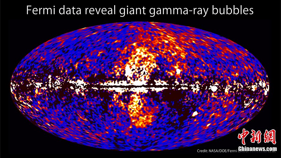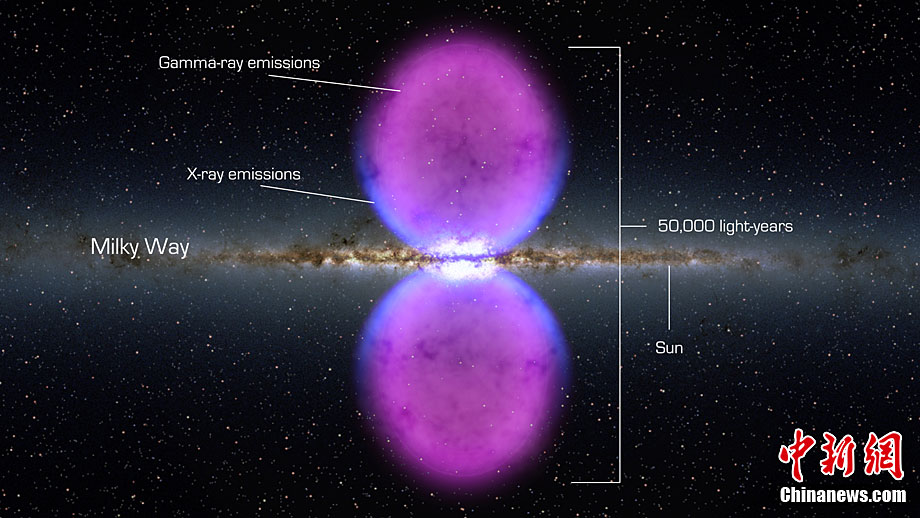 科學(xué)家日前最新探測(cè)發(fā)現(xiàn)銀河系中心溢出高能量放射線(xiàn)形成的兩個(gè)巨大氣泡,并認(rèn)為這兩個(gè)巨大的氣泡源自一個(gè)超大質(zhì)量黑洞的噴發(fā)。每個(gè)神秘的宇宙氣泡結(jié)構(gòu)直徑跨越25000光年,兩個(gè)氣泡連接起來(lái)可覆蓋可見(jiàn)夜空一半的區(qū)域,它們噴射著伽馬射線(xiàn)(高能量波長(zhǎng)光線(xiàn))。
