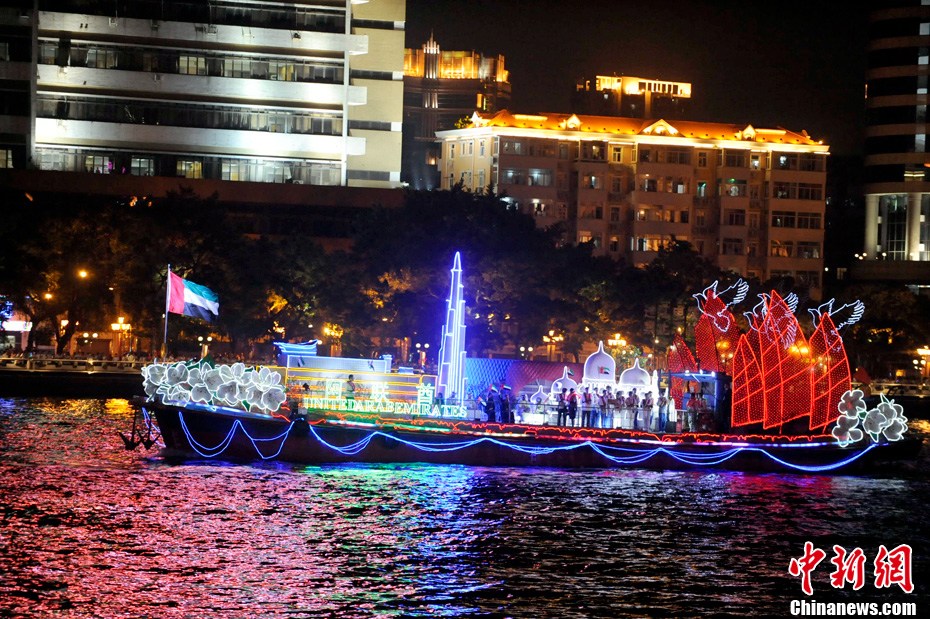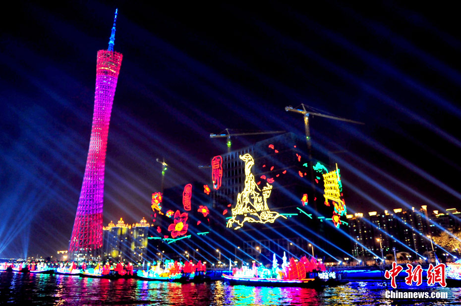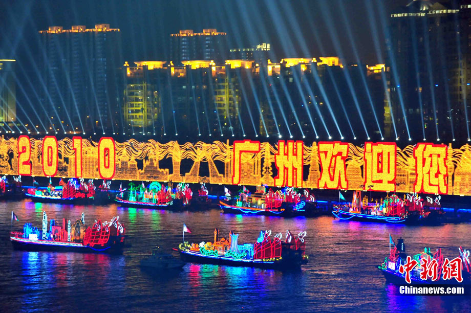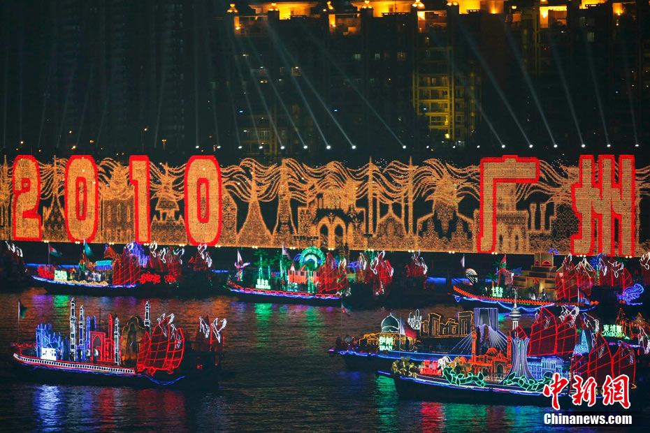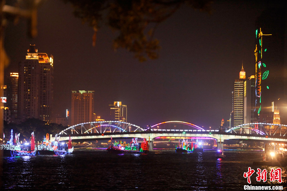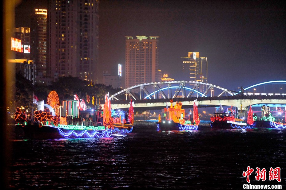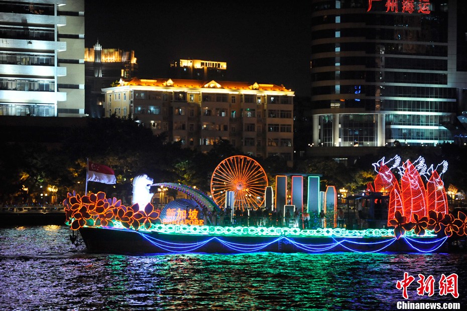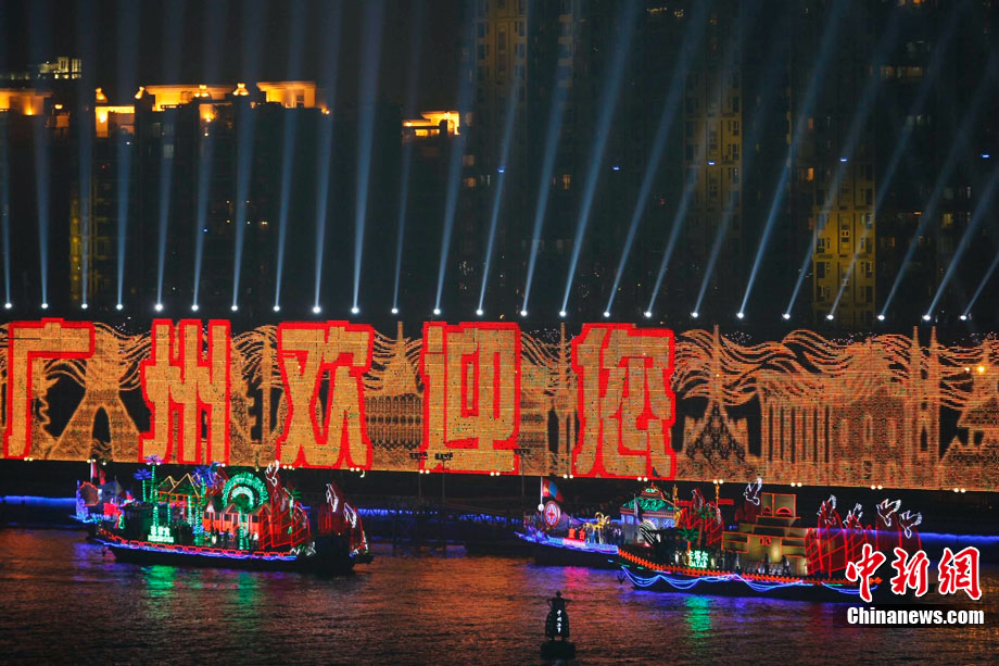 11月12日18時30分,廣州第十六屆亞運會開幕式啟動珠江巡游《一江歡歌》,45個代表團的燈光彩船暢游珠江。中新社記者 陳文 攝