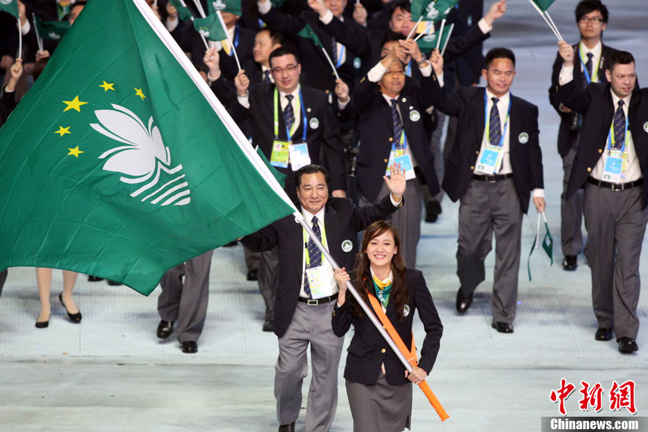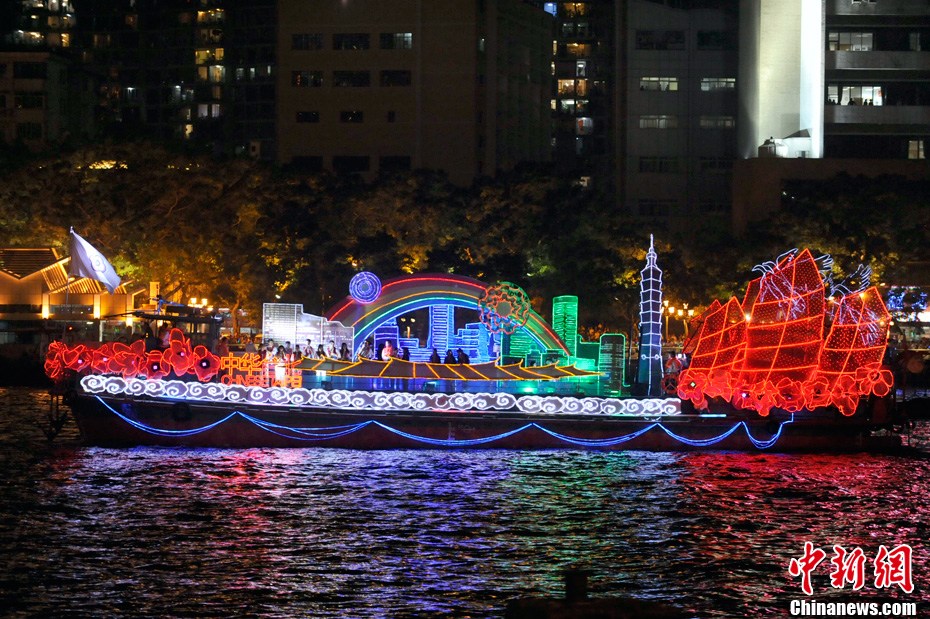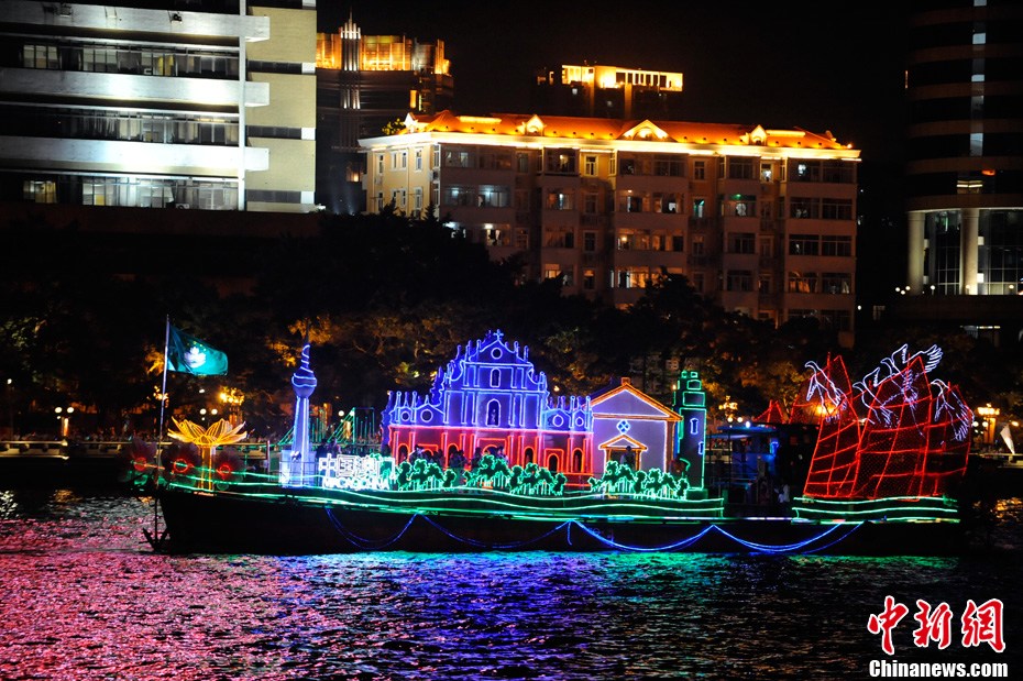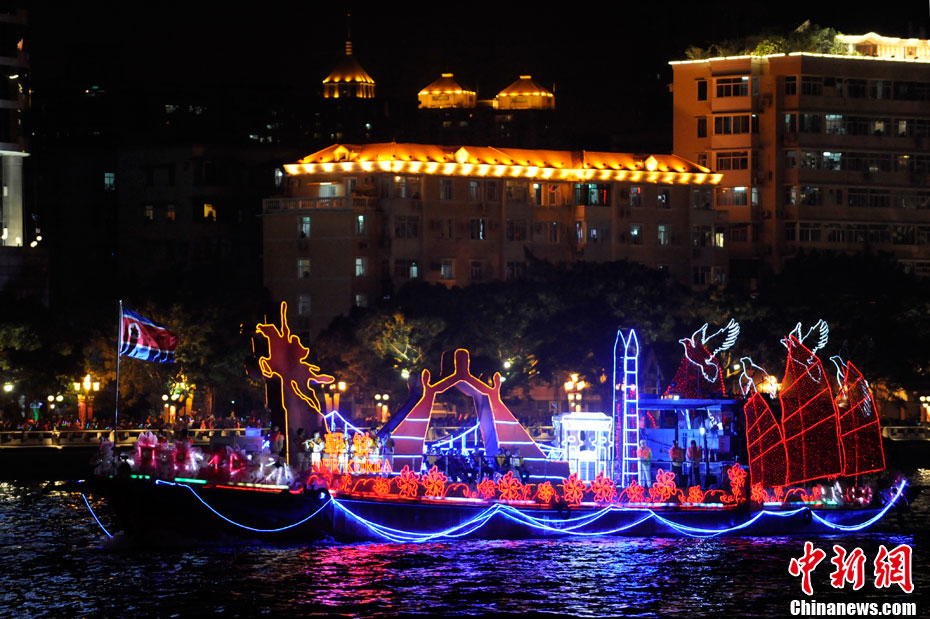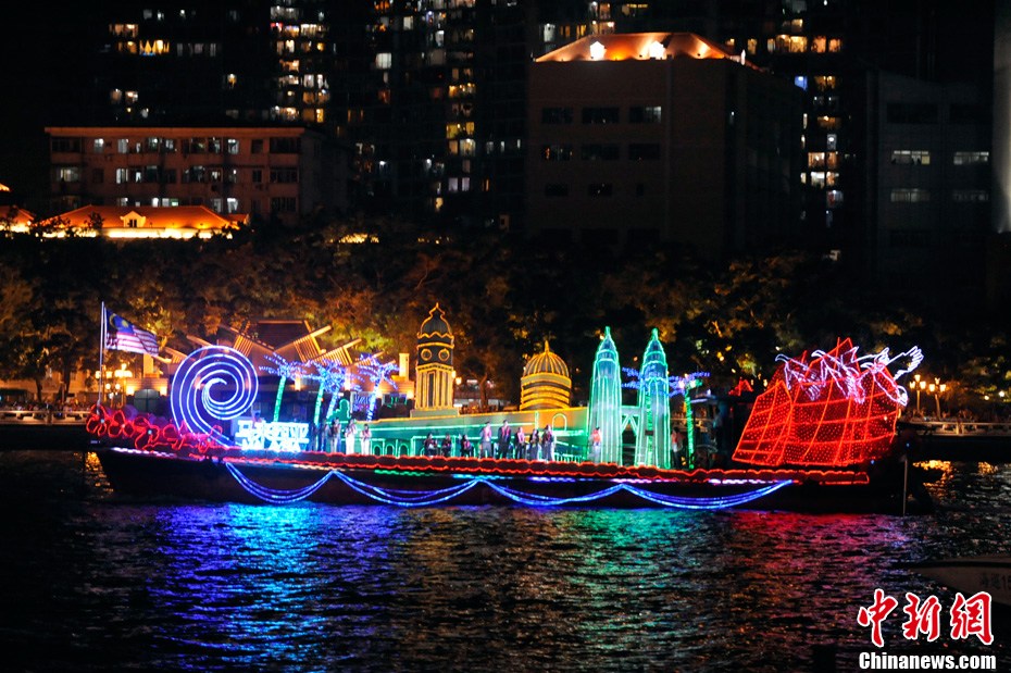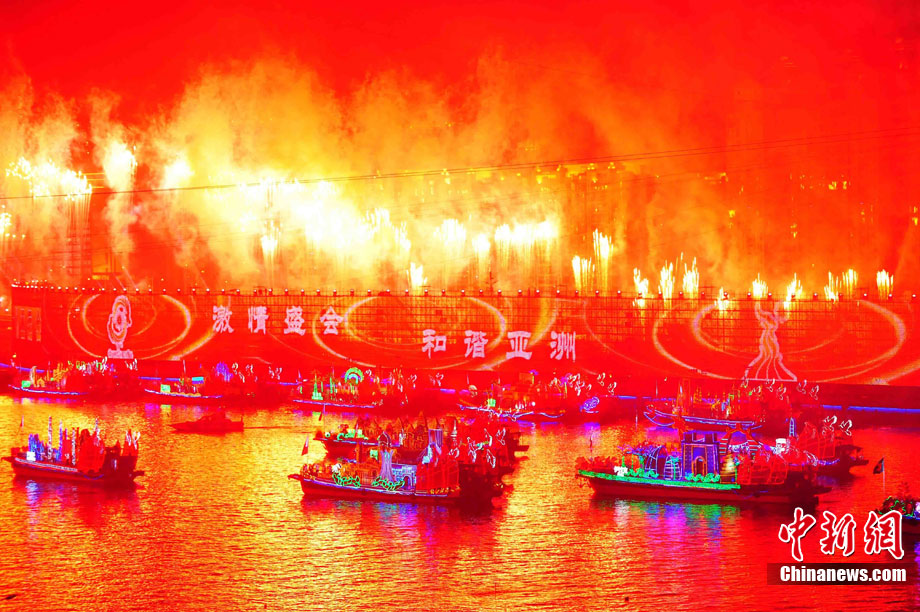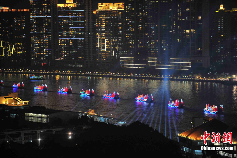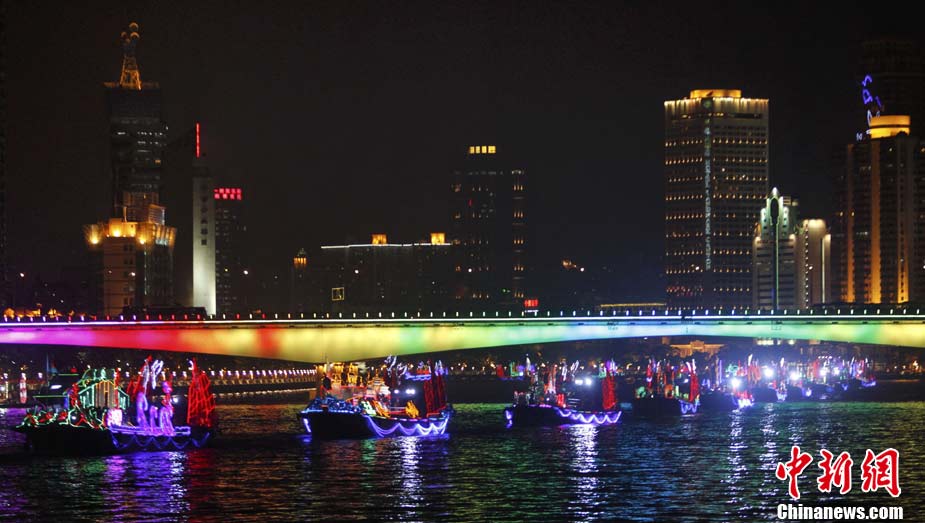 11月12日18時30分,廣州第十六屆亞運會開幕式啟動珠江巡游《一江歡歌》,45個代表團的燈光彩船暢游珠江。中新社記者 陳文 攝