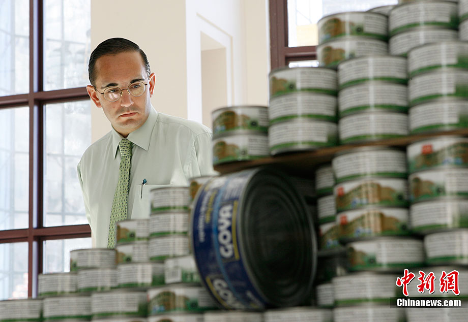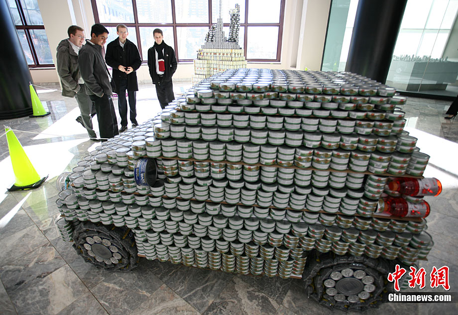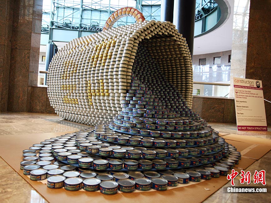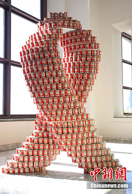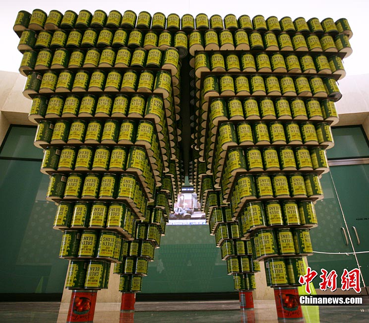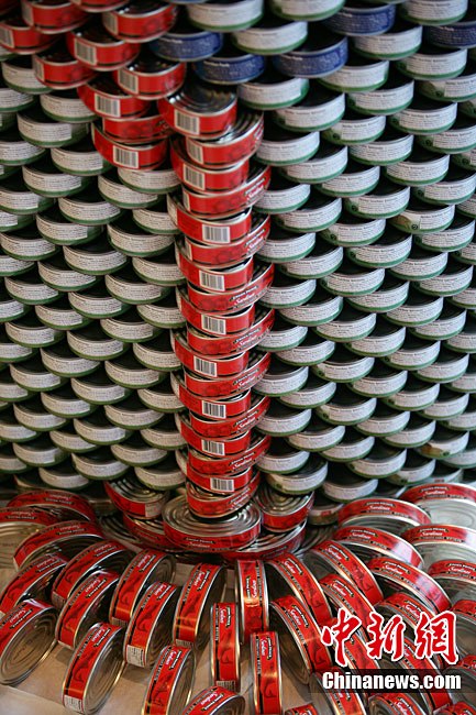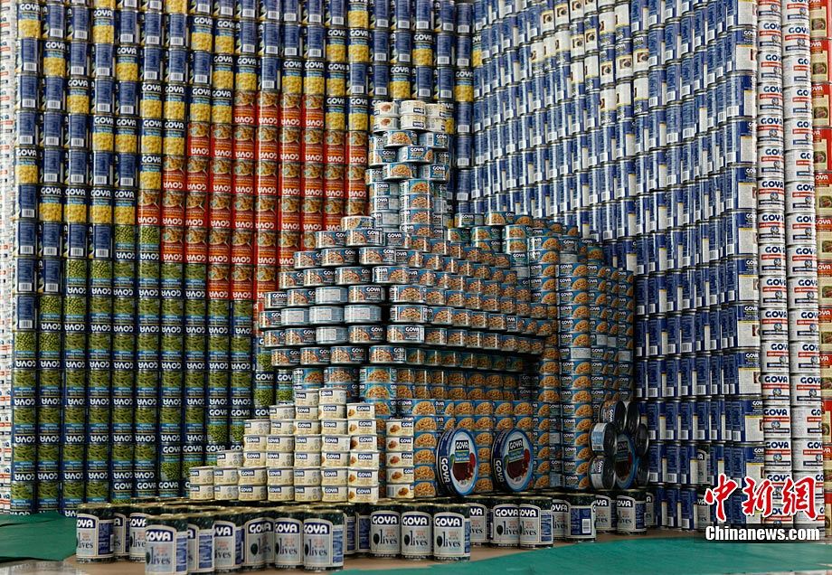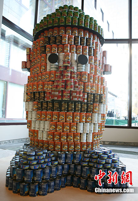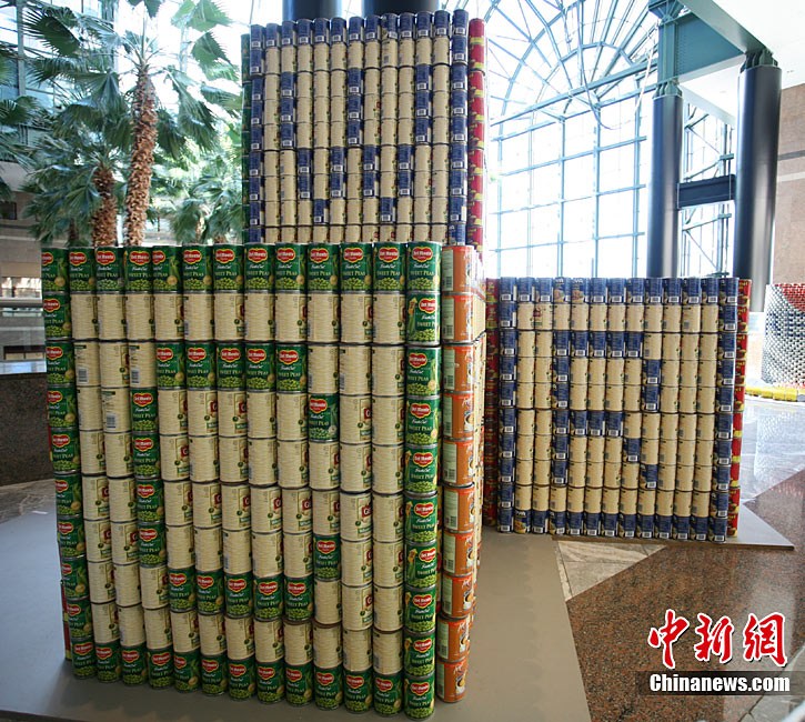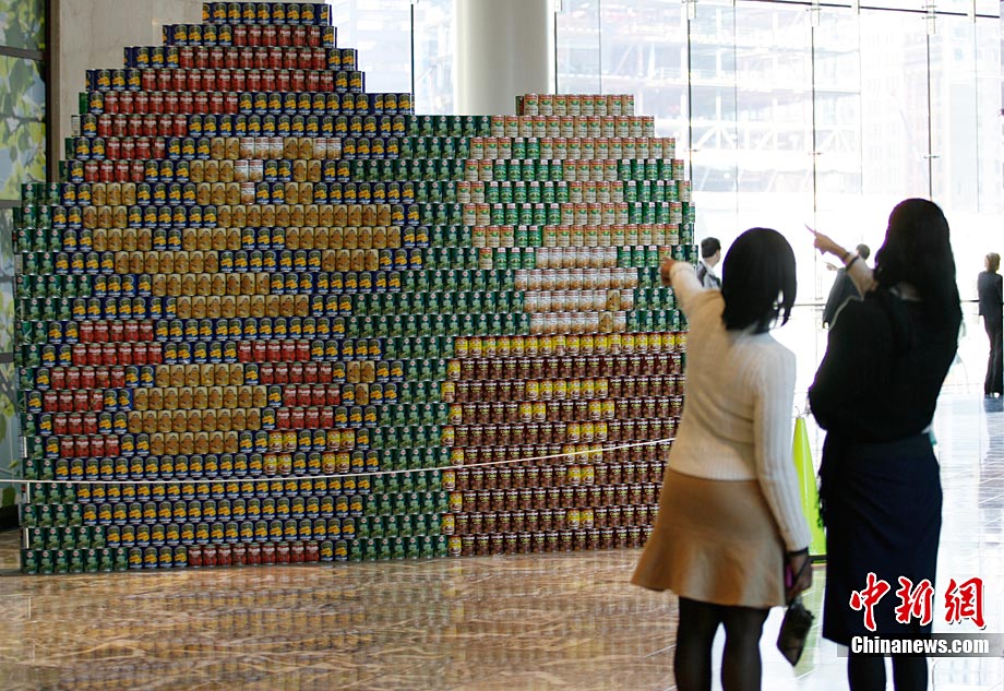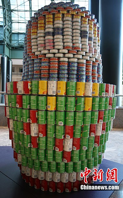 當(dāng)?shù)貢r間11月11日,美國紐約世界金融中心的冬園展出了一組用各種食品罐頭組合成的雕塑作品。此次展覽結(jié)束后,這些作品將被拆除,所有的罐頭都將被捐給慈善機構(gòu)“城市收獲”,用來援助仍在忍受饑餓的人。