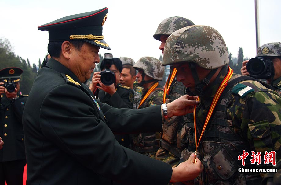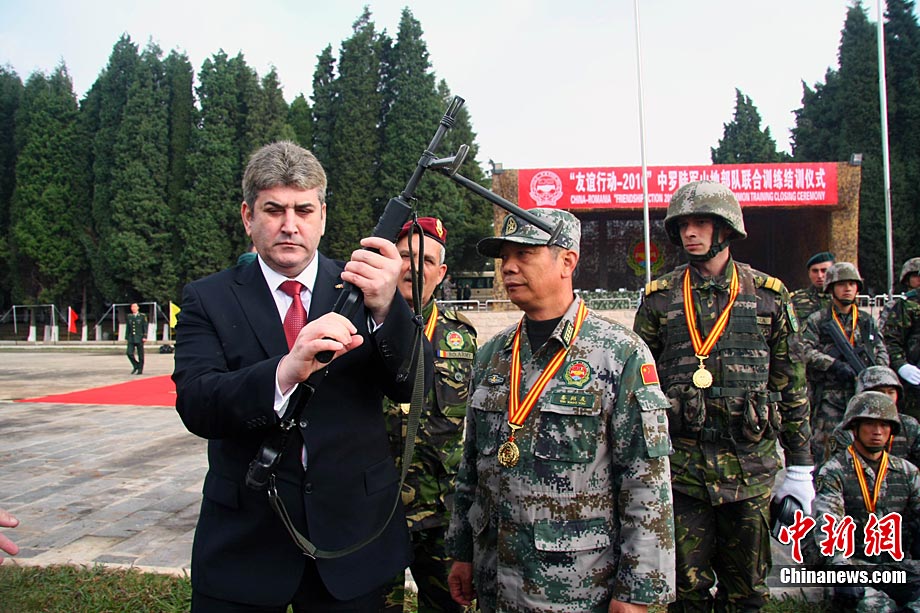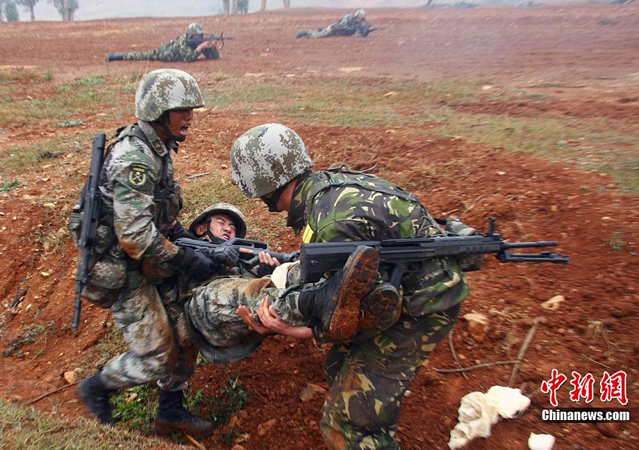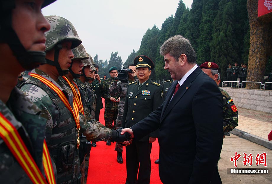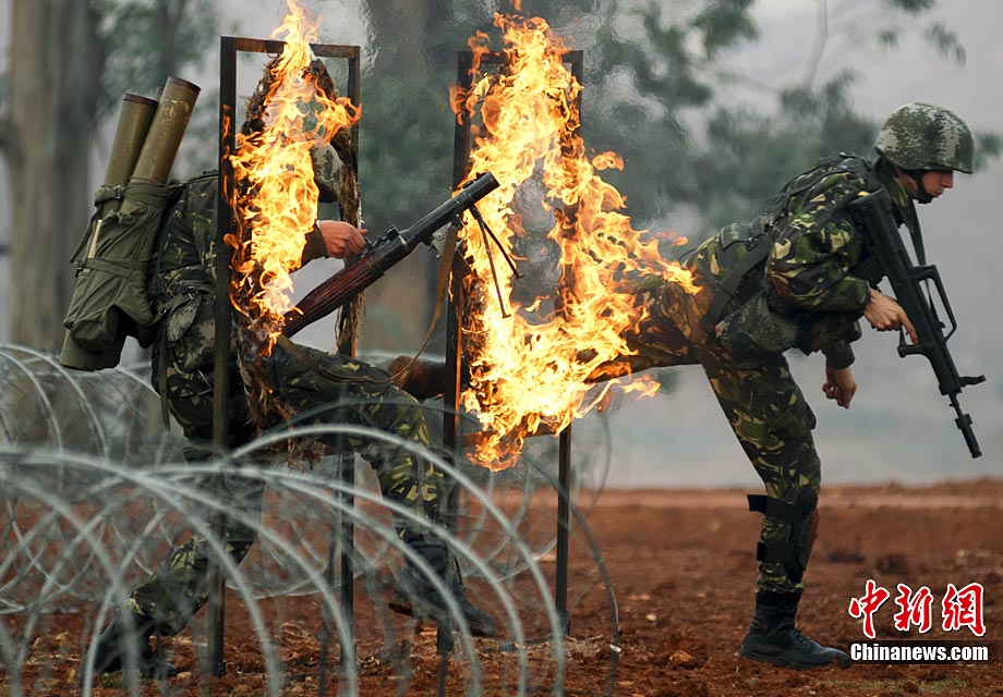 11月13日,“友誼行動(dòng)-2010”中國(guó)與羅馬尼亞陸軍山地部隊(duì)在云南昆明進(jìn)行了9天的聯(lián)合訓(xùn)練后結(jié)束。中羅雙方士兵在結(jié)訓(xùn)儀式上進(jìn)行了步槍、狙擊槍射擊的匯報(bào)表演和混合編隊(duì)克服山地障礙等戰(zhàn)術(shù)綜合演練。圖為中羅雙方士兵表演戰(zhàn)術(shù)綜合演練穿過(guò)火圈。中新社發(fā) 任東 攝