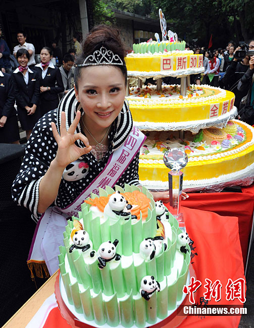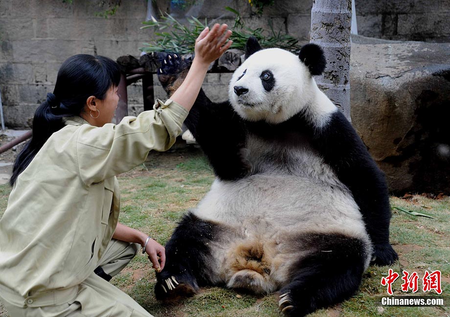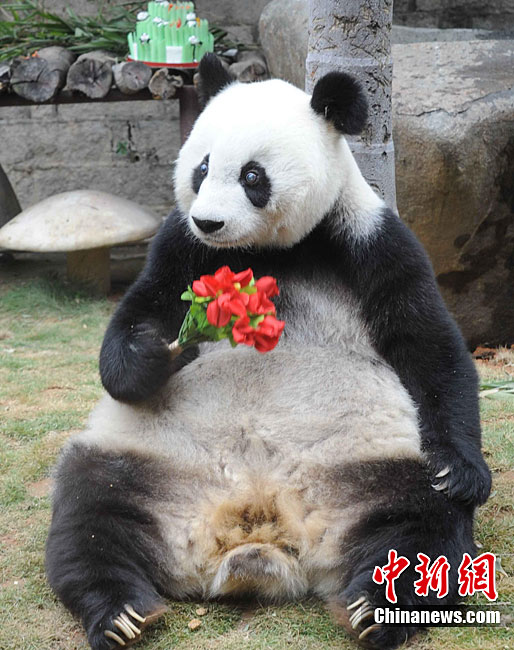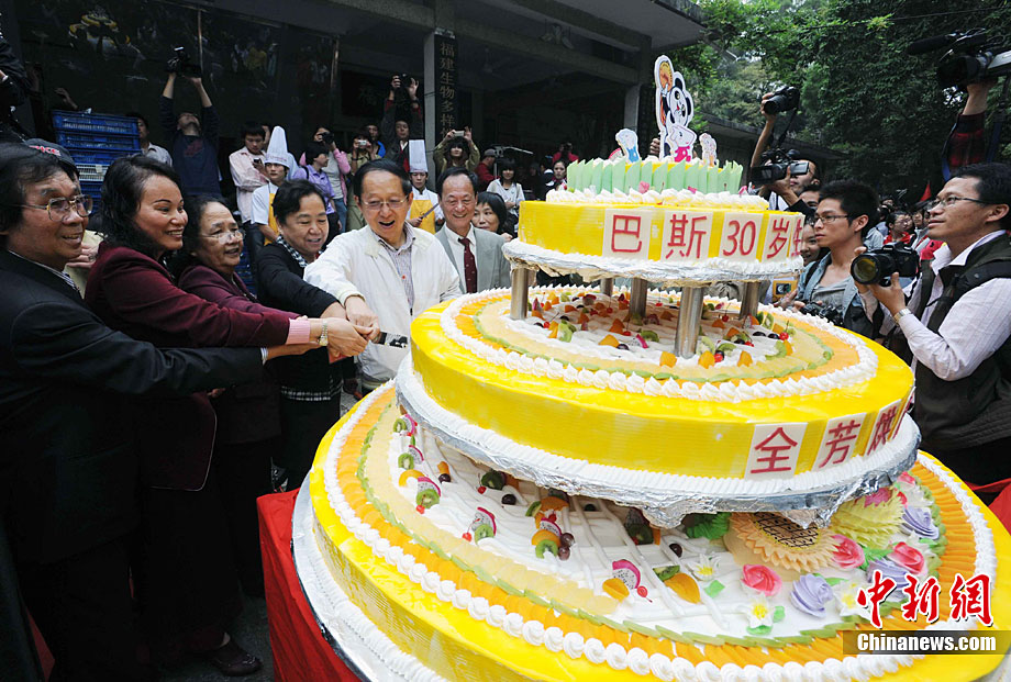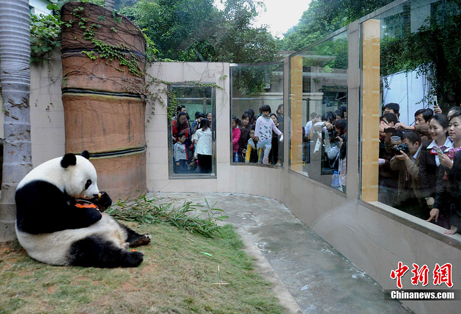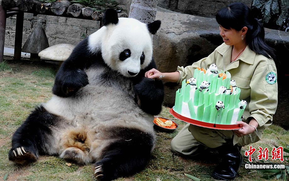 11月13日,福州熊貓世界、福州大熊貓研究中心在福州為聞名海內(nèi)外的1990年北京亞運(yùn)會(huì)吉祥物“盼盼”的原型——大熊貓明星“巴斯”舉辦隆重的30歲(相當(dāng)于人類一百多歲)生日慶典系列活動(dòng),來自海內(nèi)外三千多名各界人士參加該慶典活動(dòng)。福州熊貓世界飼養(yǎng)員為歡度30歲生日(相當(dāng)于人類一百多歲)的北京亞運(yùn)會(huì)吉祥物“盼盼”的原型——大熊貓明星“巴斯”送上專門制作的生日蛋糕。中新社記者 劉可耕 攝