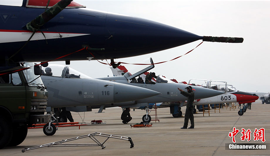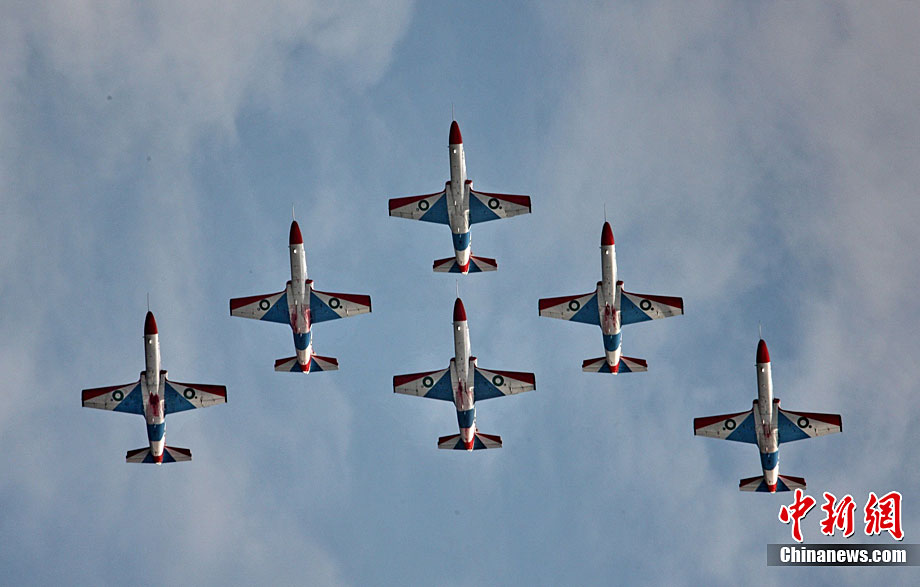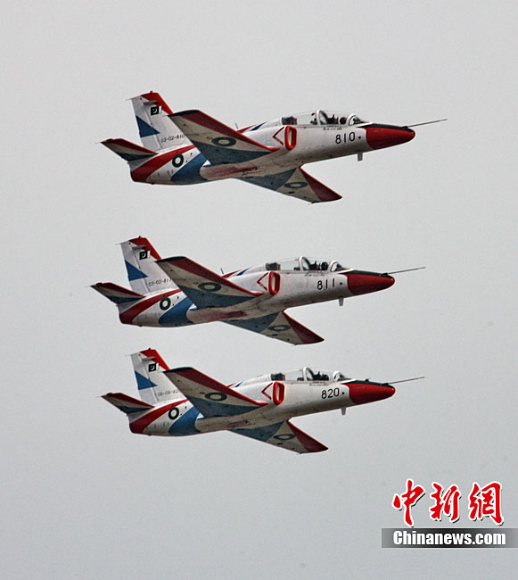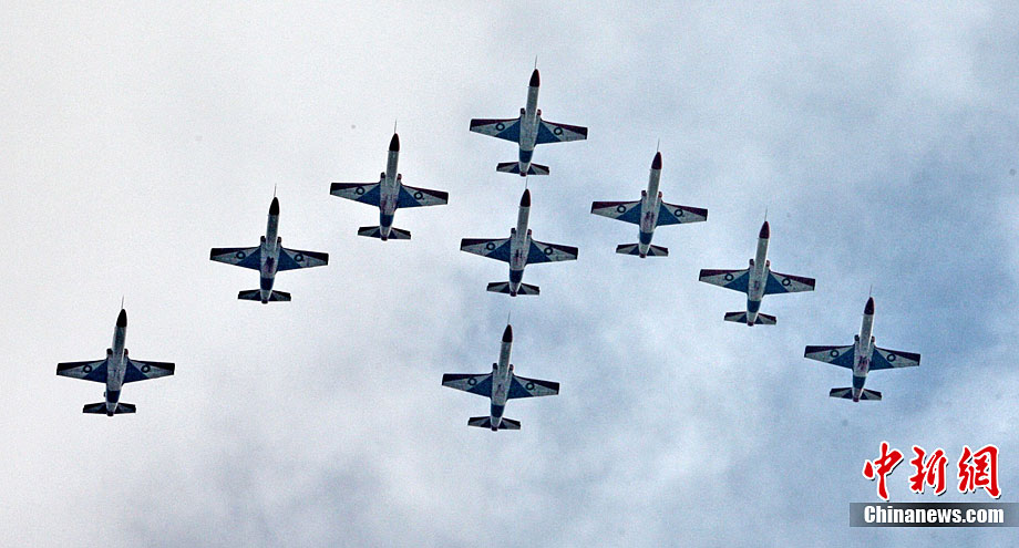 11月13日下午,巴基斯坦空軍“雄獅”飛行表演隊的飛行員駕駛k8教練機進行九機密集隊形飛行訓(xùn)練。昨日,巴基斯坦空軍“雄獅”飛行表演隊抵達珠海,這支表演隊由10架K8教練機和一架C130運輸保障機組成。由外國飛行員駕駛“中國造”飛機在中國航展上表演,必將是一道優(yōu)美而又特別的風(fēng)景。圖為巴基斯坦空軍“雄獅”飛行表演隊的飛行員駕駛k8教練機進行九機密集隊形飛行訓(xùn)練。圖片來源:CNSPHOTO 喬天富 攝