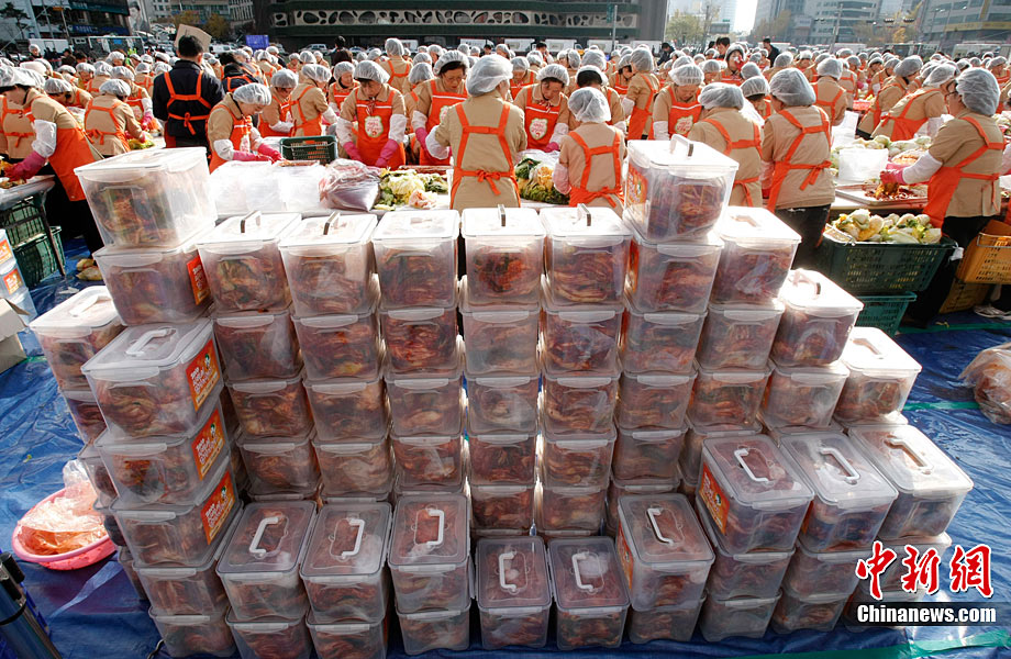 11月16日,幾千名韓國(guó)市民聚集首爾廣場(chǎng),腌制總共12萬(wàn)顆白菜泡菜,贈(zèng)給低收入家庭。泡菜是韓國(guó)最不可或缺的食物,冬季漸近,腌制白菜泡菜更成為韓國(guó)人生活中一件大事。
