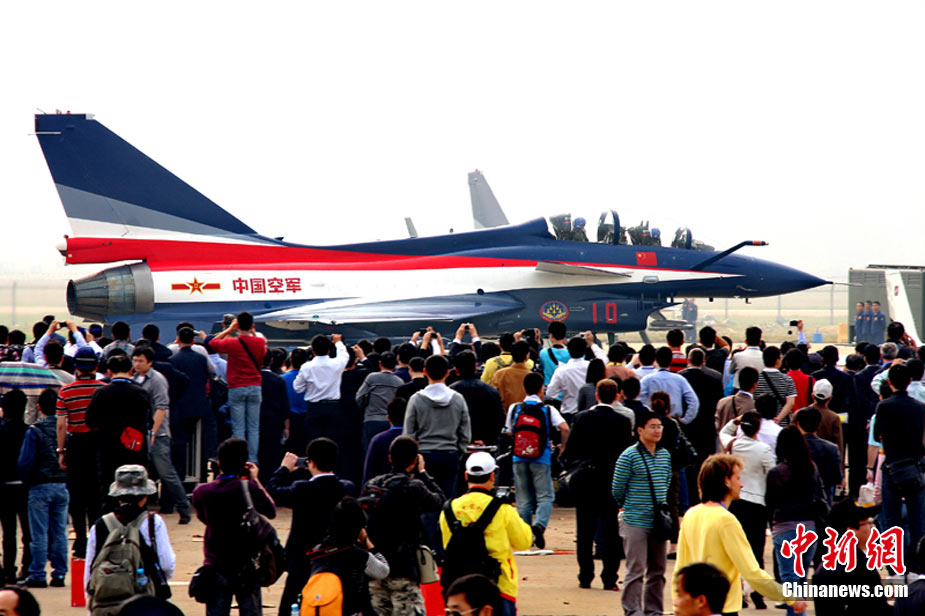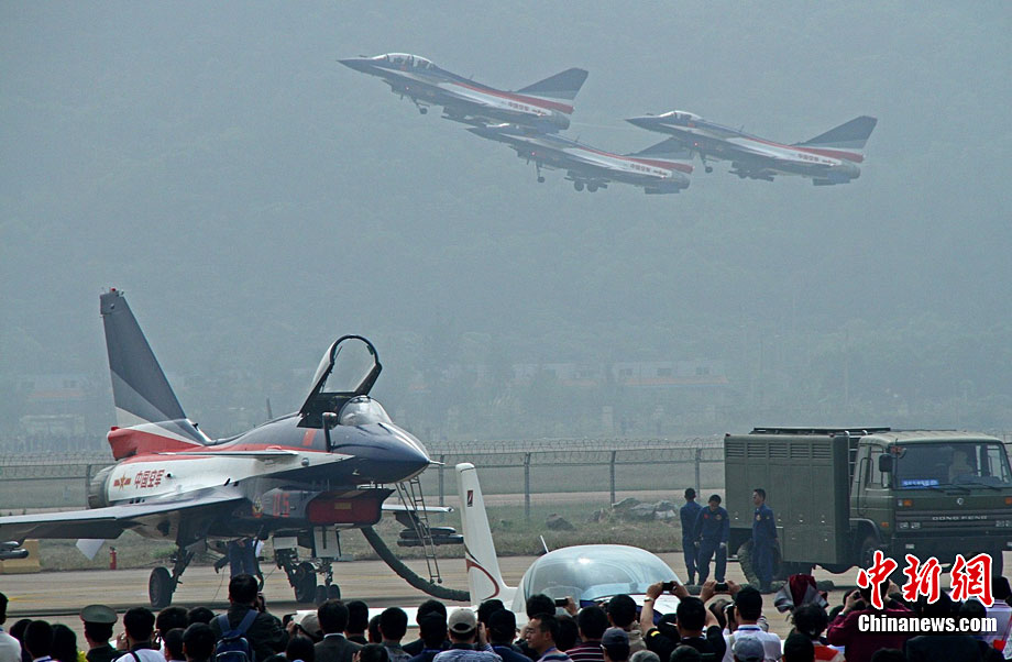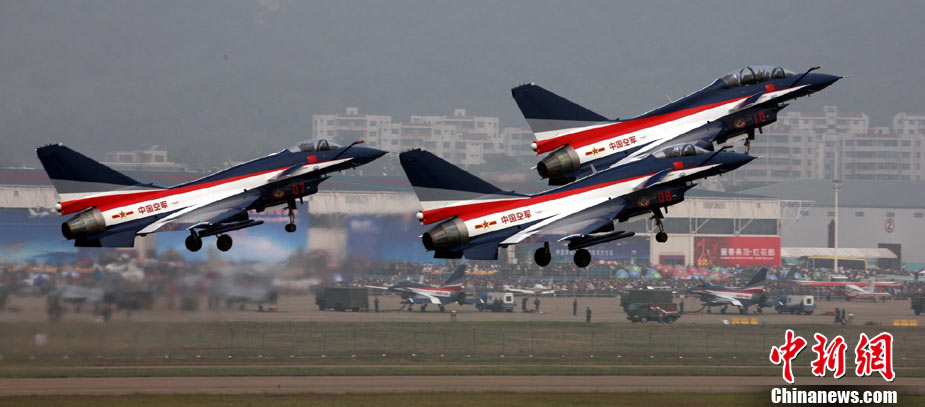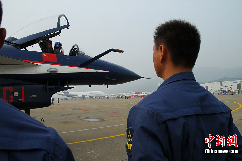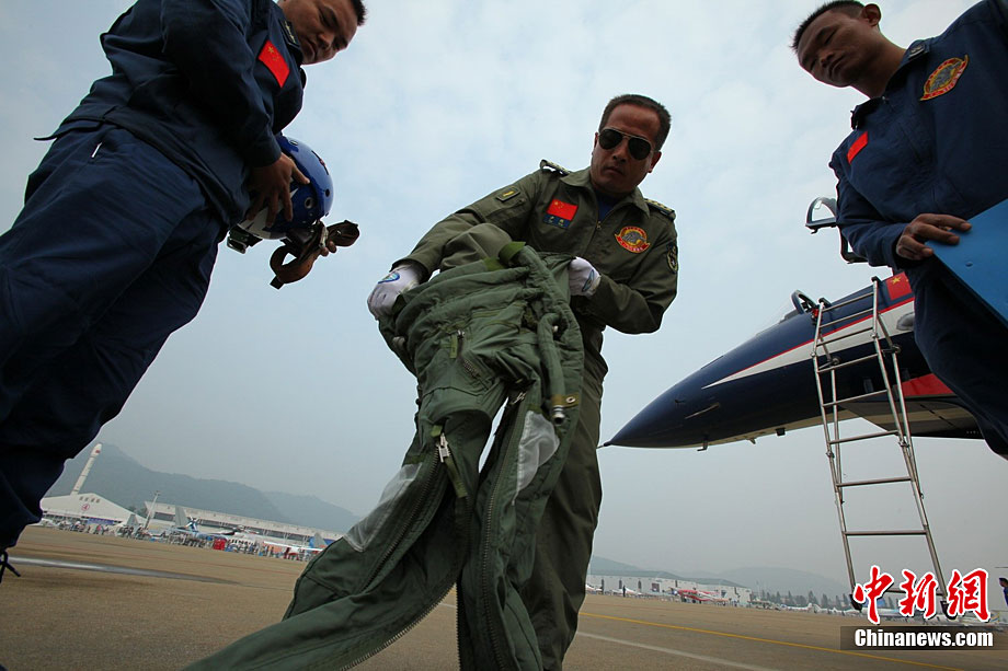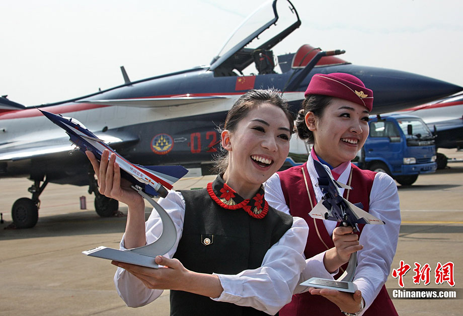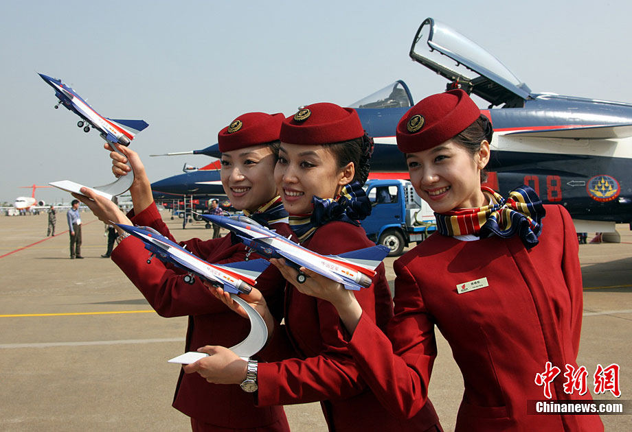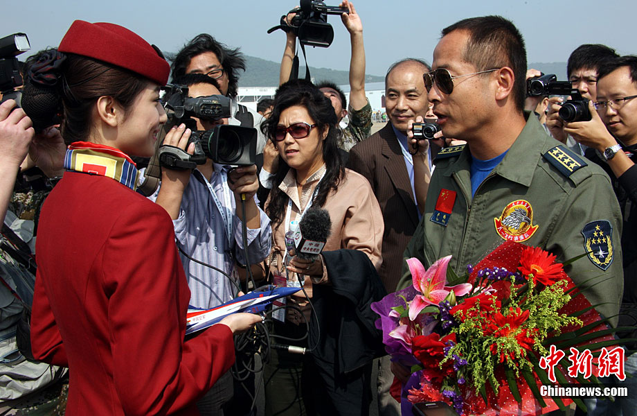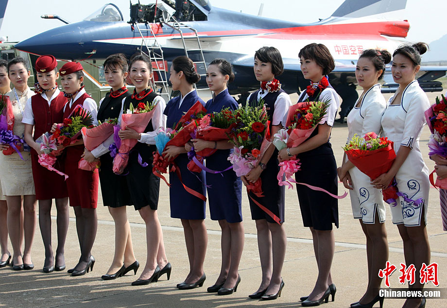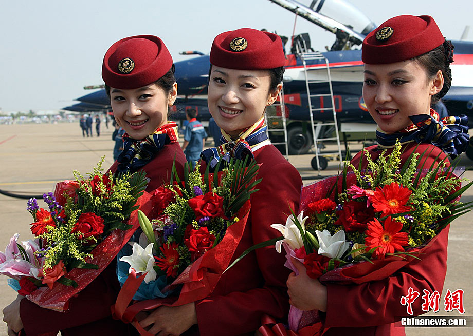 11月17日,在珠海第8屆中國國際航空航天博覽會上,中航公司組織中國獲獎十佳空中乘務(wù)員,向殲10飛機(jī)總設(shè)計師、剛做完飛行表演的空軍八一飛行表演隊(duì)的空中英豪們獻(xiàn)上鮮花。圖片來源:CNSPHOTO 喬天富 攝