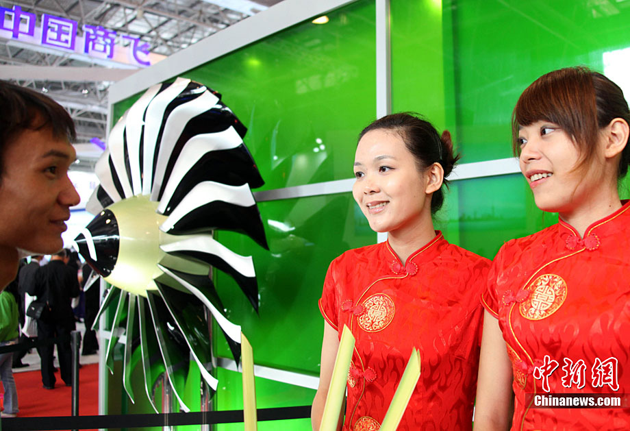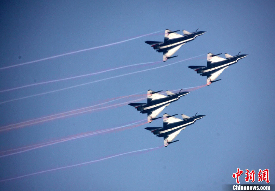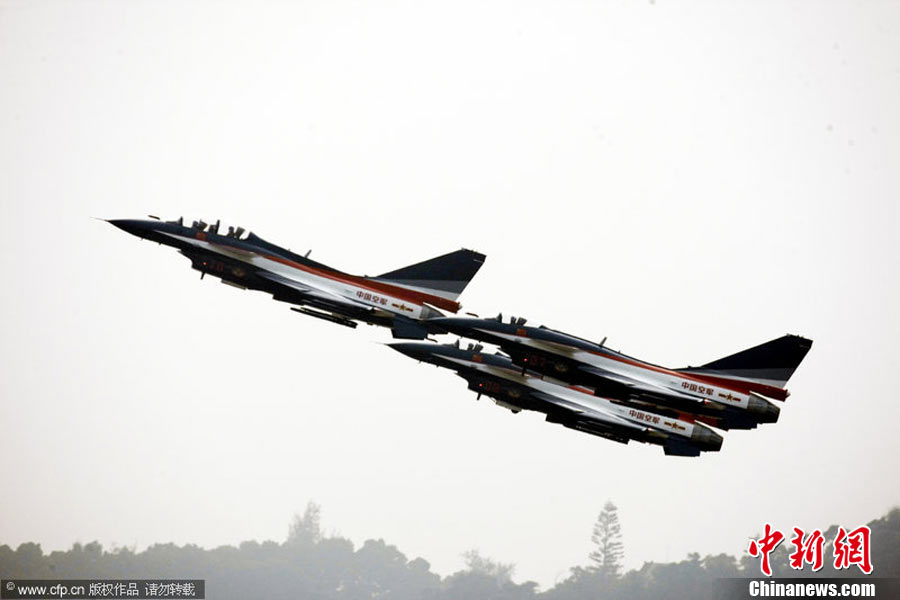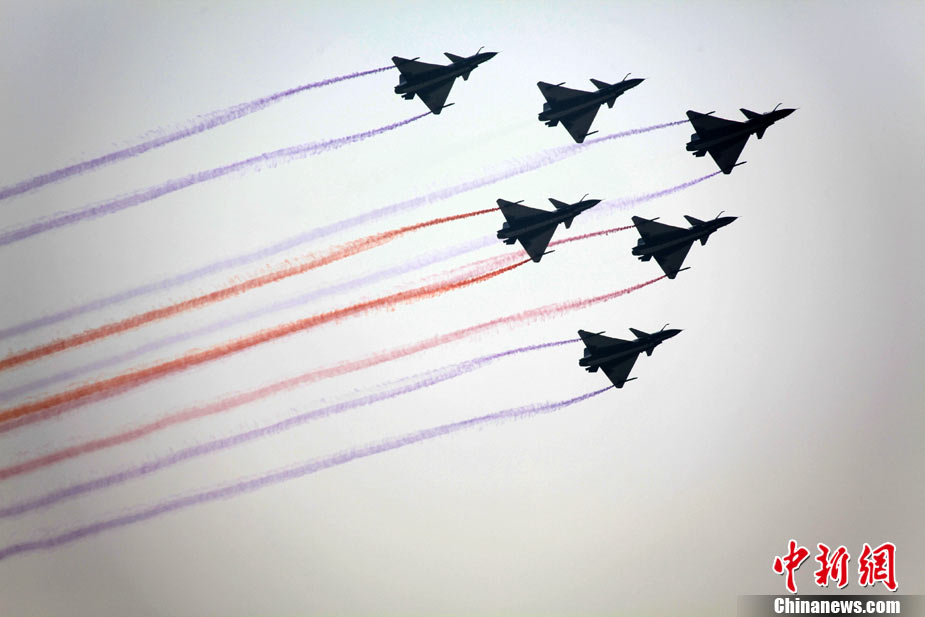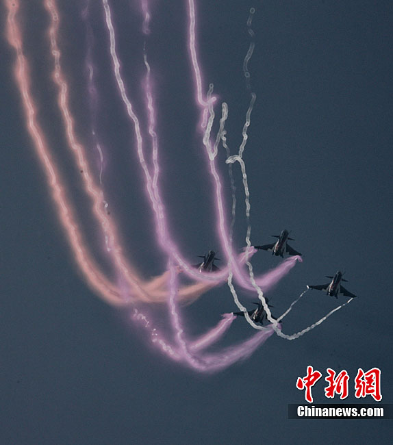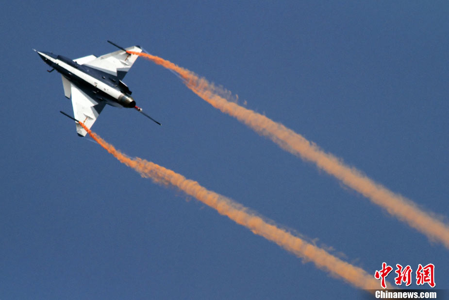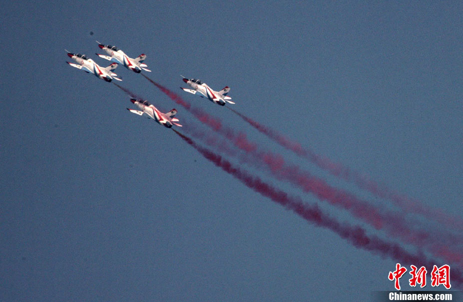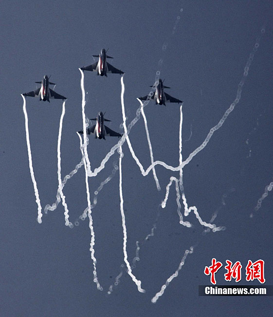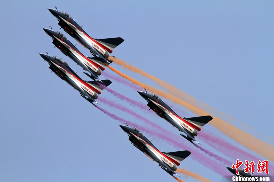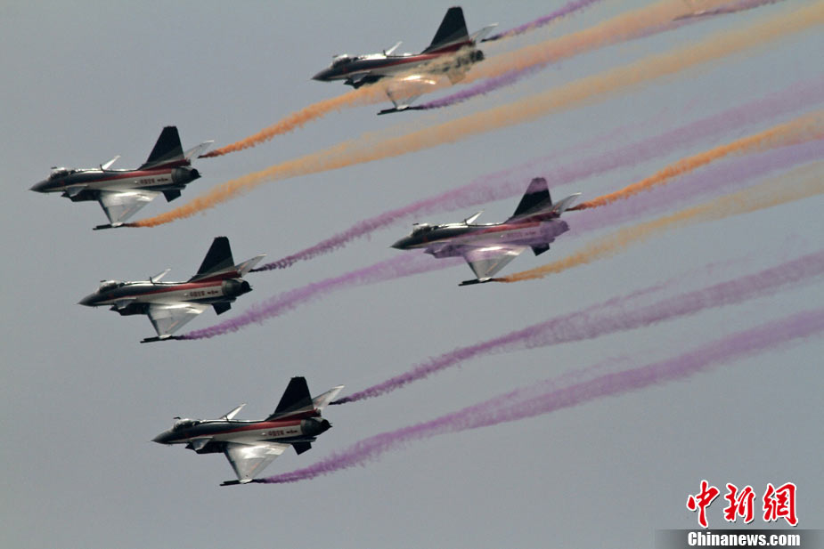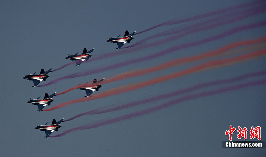 11月17日,在珠海第8屆中國國際航空航天博覽會上,中航公司組織中國獲獎十佳空中乘務(wù)員,向殲10飛機(jī)總設(shè)計師、剛做完飛行表演的空軍八一飛行表演隊(duì)的空中英豪們獻(xiàn)上鮮花。圖片來源:CNSPHOTO 喬天富 攝