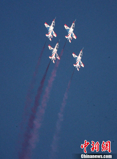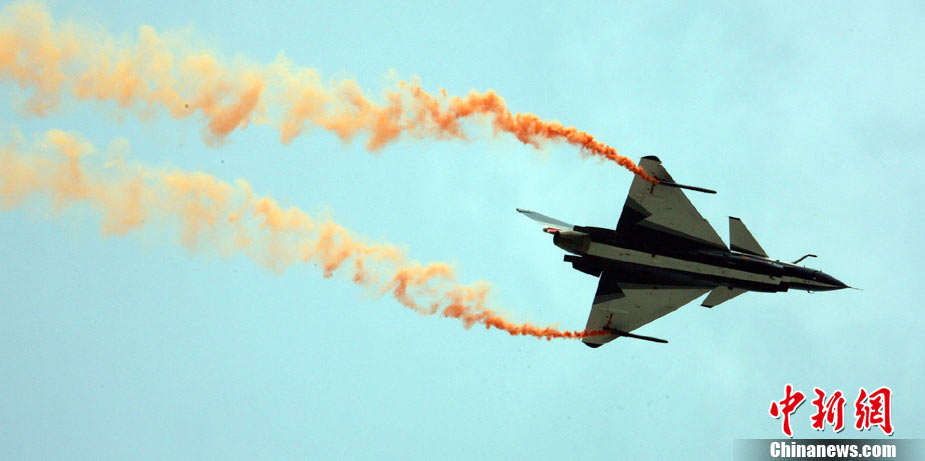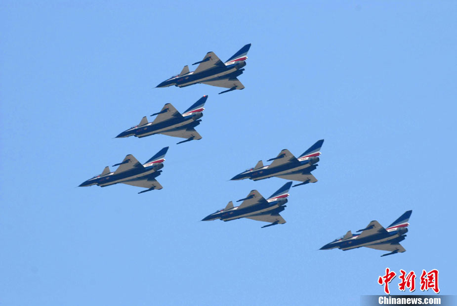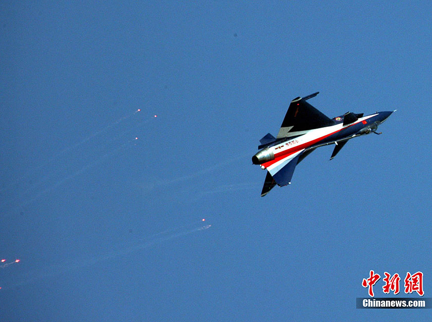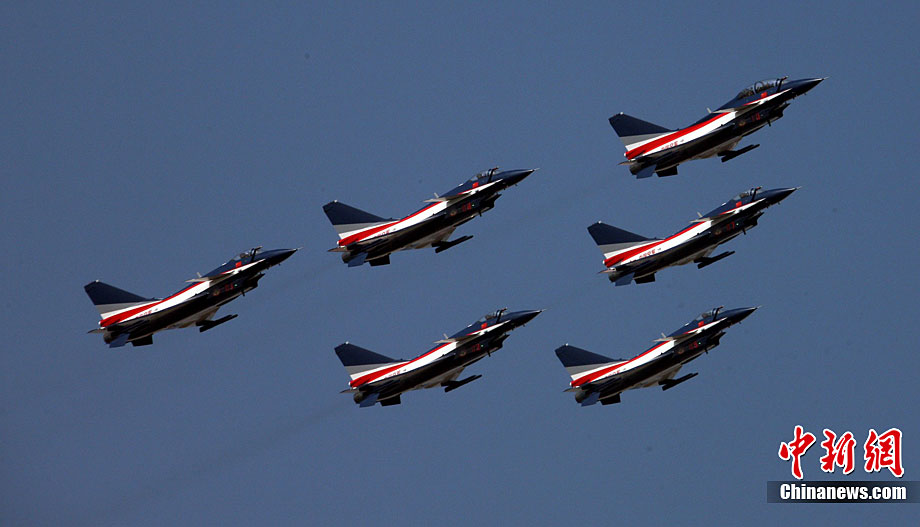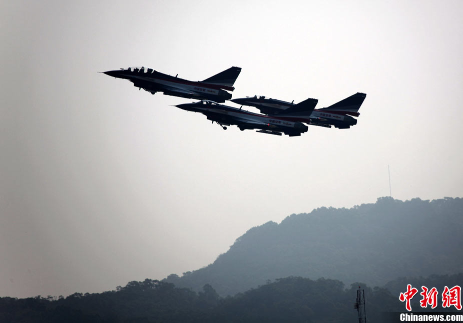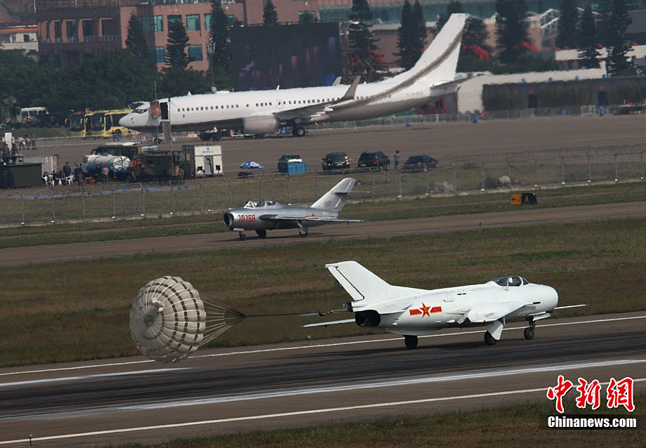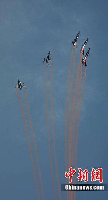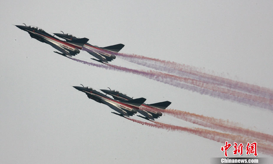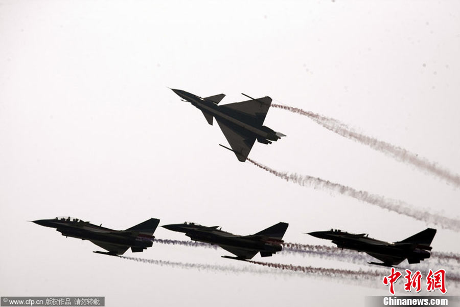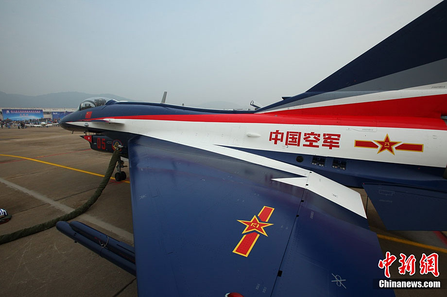 11月17日,在珠海第8屆中國國際航空航天博覽會上,中航公司組織中國獲獎十佳空中乘務(wù)員,向殲10飛機(jī)總設(shè)計師、剛做完飛行表演的空軍八一飛行表演隊(duì)的空中英豪們獻(xiàn)上鮮花。圖片來源:CNSPHOTO 喬天富 攝