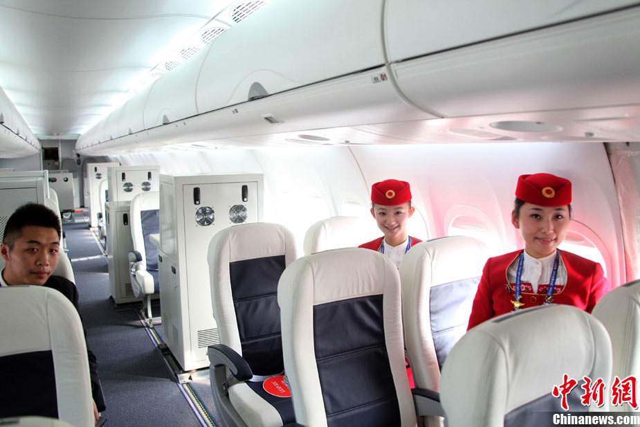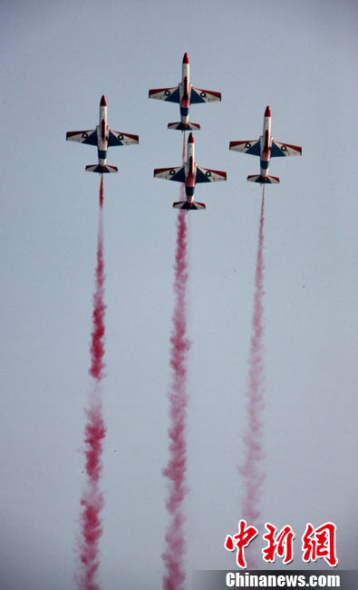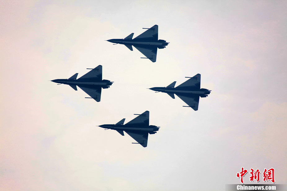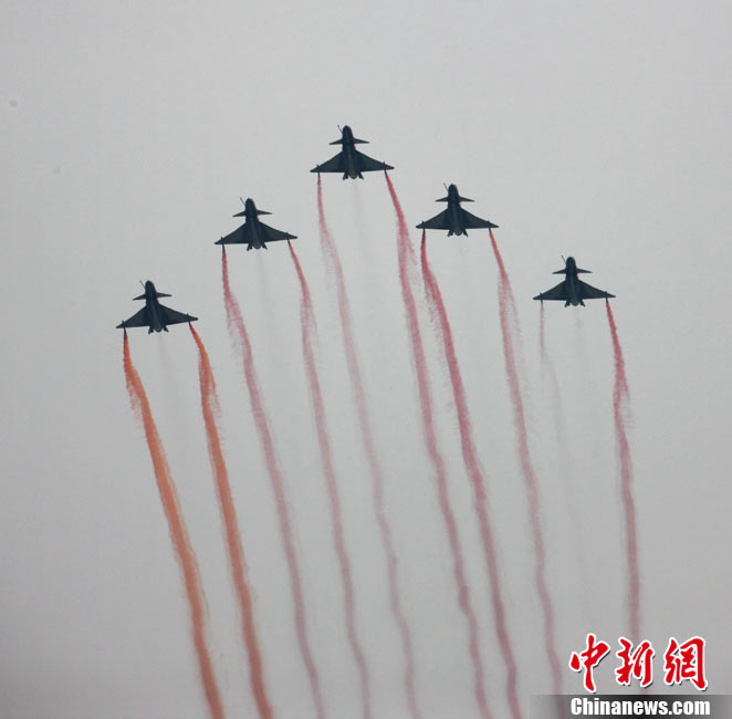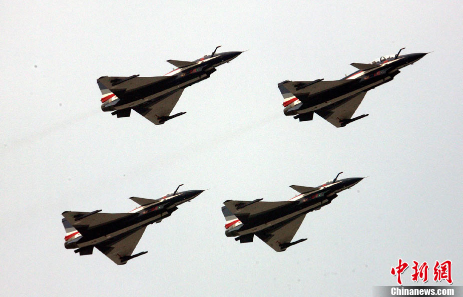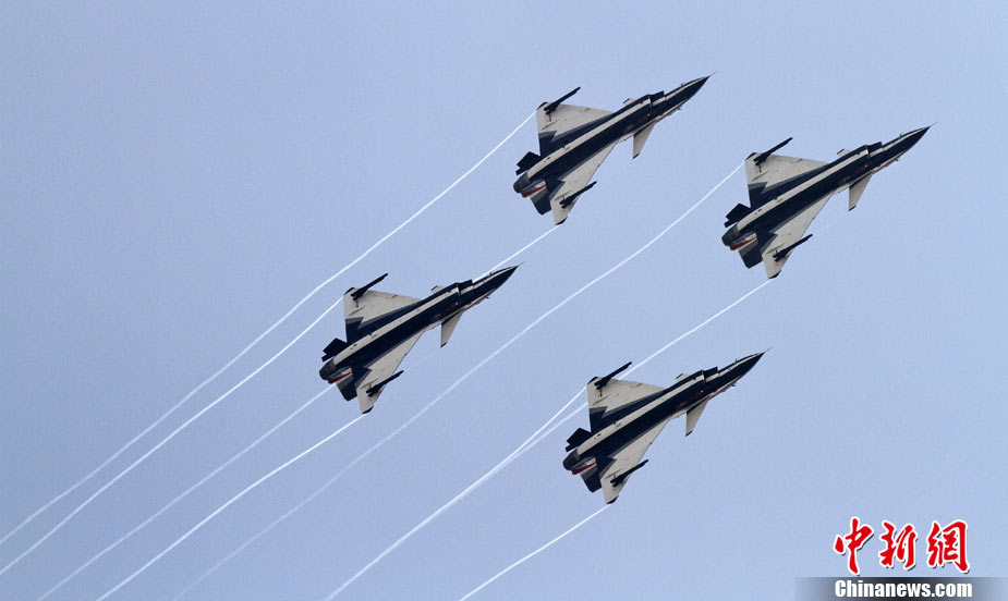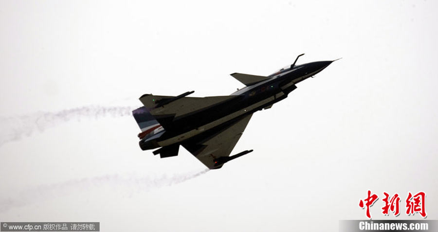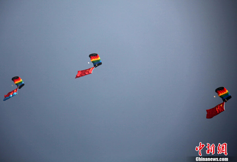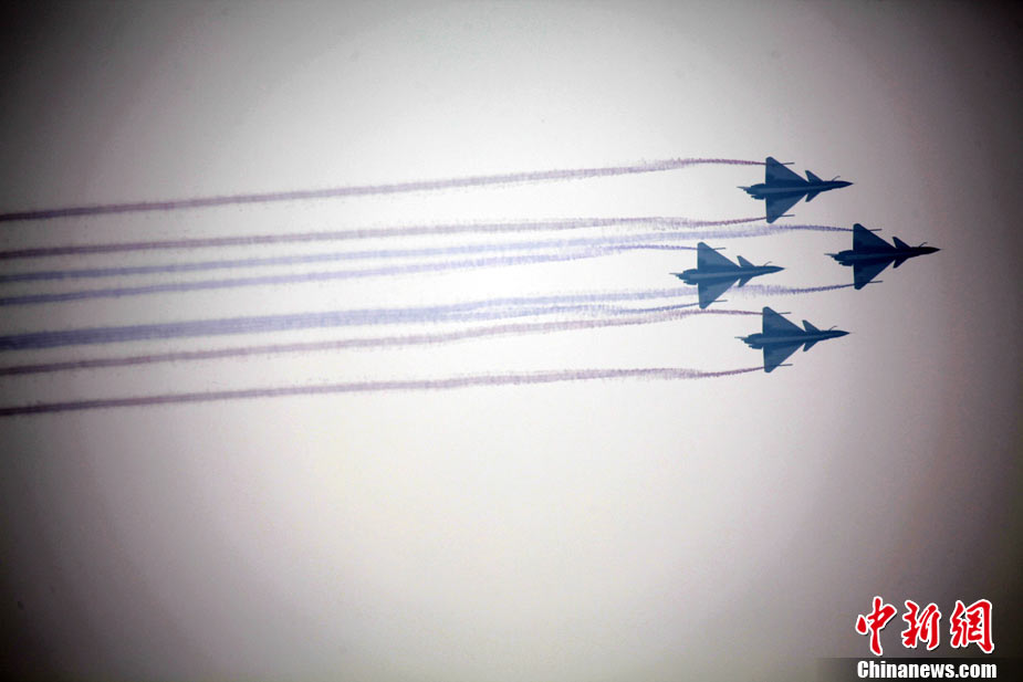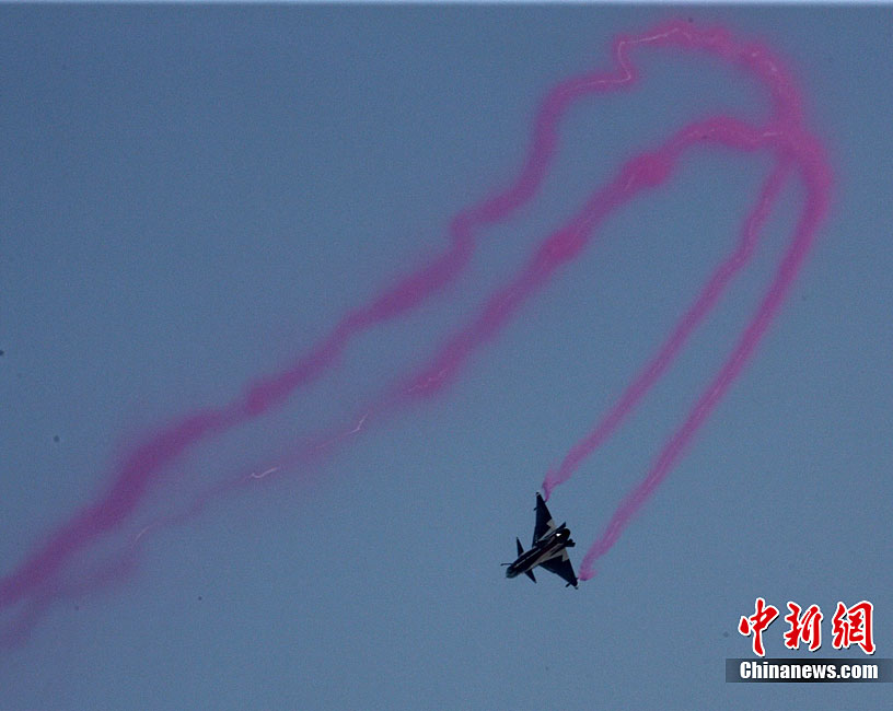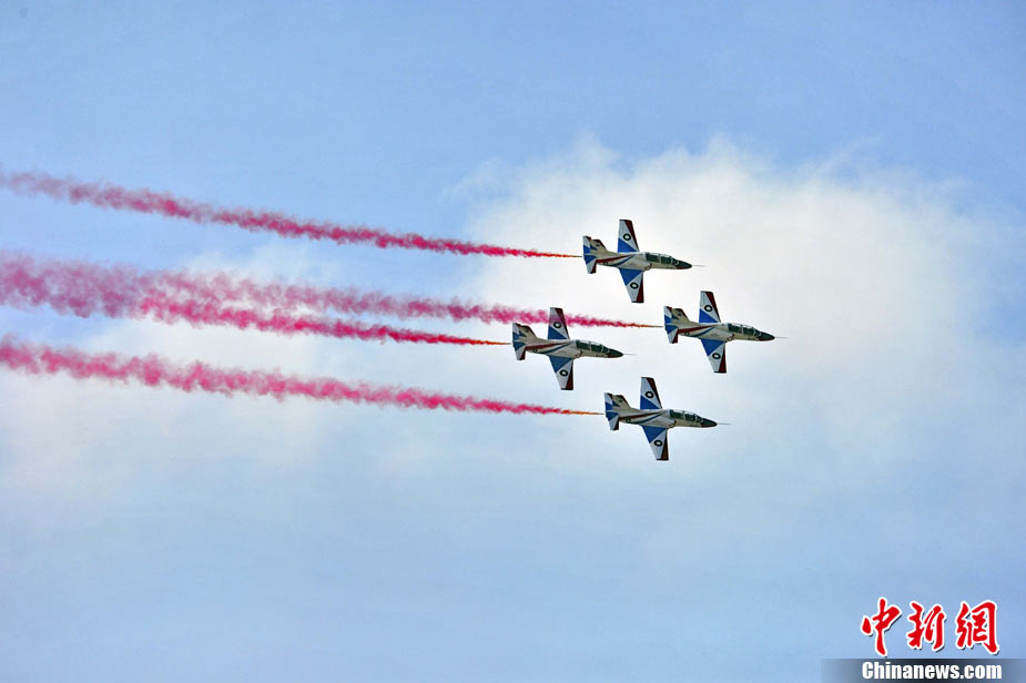 11月17日,在珠海第8屆中國國際航空航天博覽會上,中航公司組織中國獲獎十佳空中乘務(wù)員,向殲10飛機(jī)總設(shè)計師、剛做完飛行表演的空軍八一飛行表演隊(duì)的空中英豪們獻(xiàn)上鮮花。圖片來源:CNSPHOTO 喬天富 攝