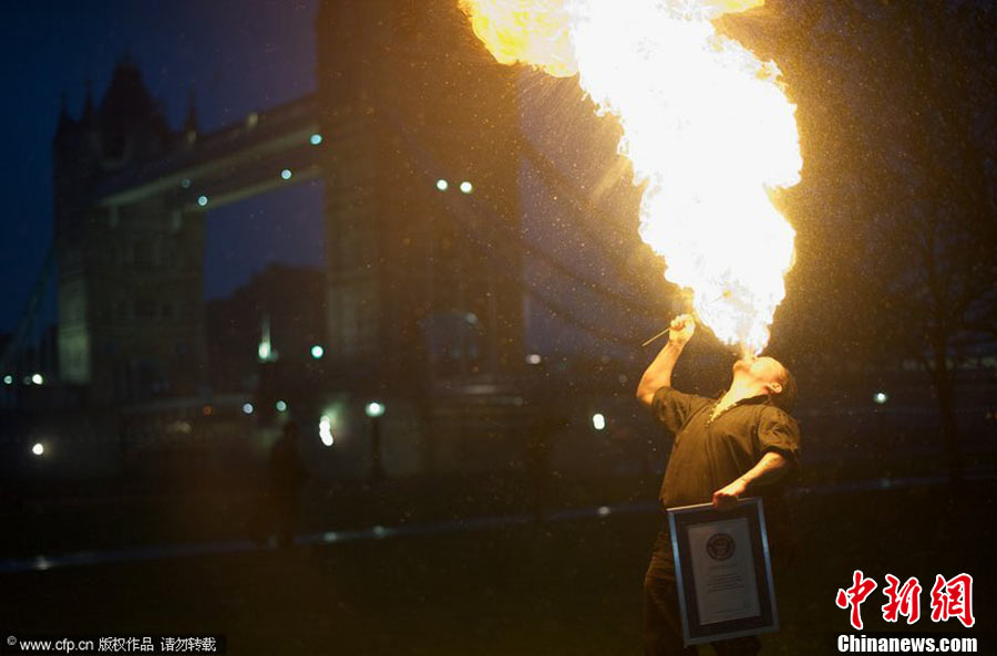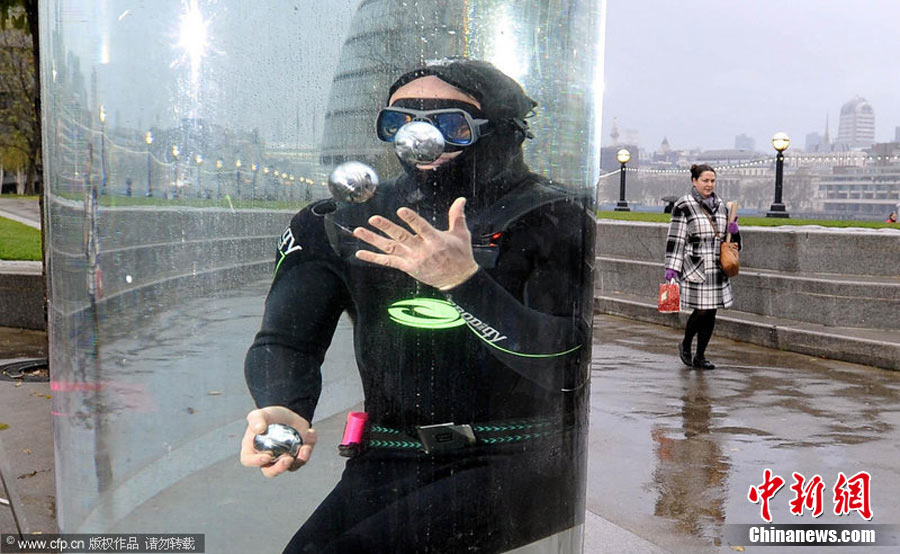 11月18日,一年一度的“吉尼斯世界紀(jì)錄日”。當(dāng)日,世界各地的牛人紛紛亮相“一展身手”。圖為在英國倫敦,來自北德文郡諾瑟姆的梅林·卡多根以1分20秒的時間創(chuàng)造了一口氣在水下拋三個球最長時間的世界紀(jì)錄。圖片來源:CFP視覺中國