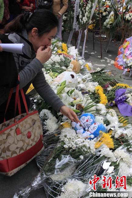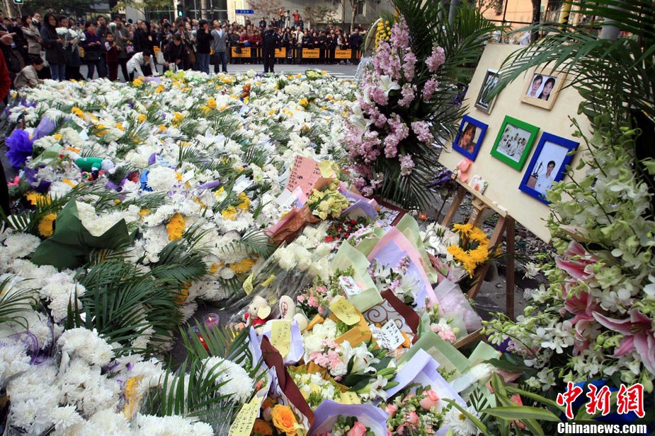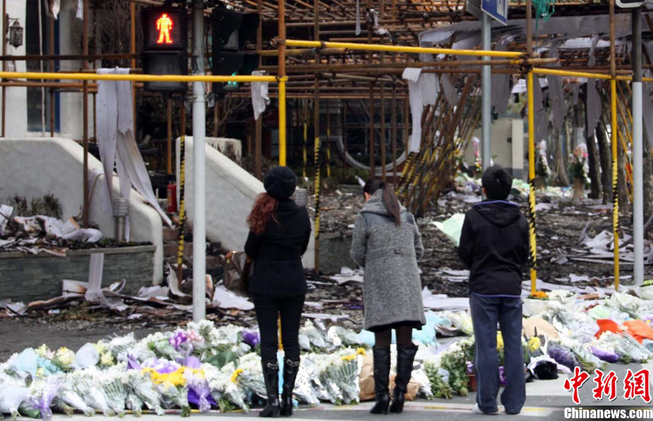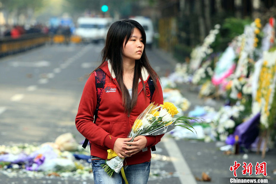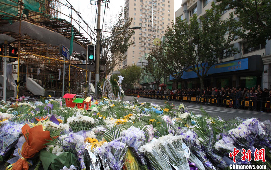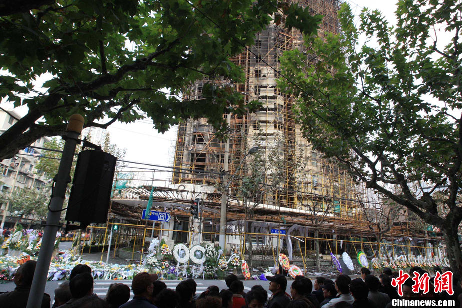 11月21日,上海在靜安區(qū)“11·15”特大火災(zāi)現(xiàn)場(chǎng)舉行向遇難者致哀活動(dòng)。中新社記者 潘索菲 攝