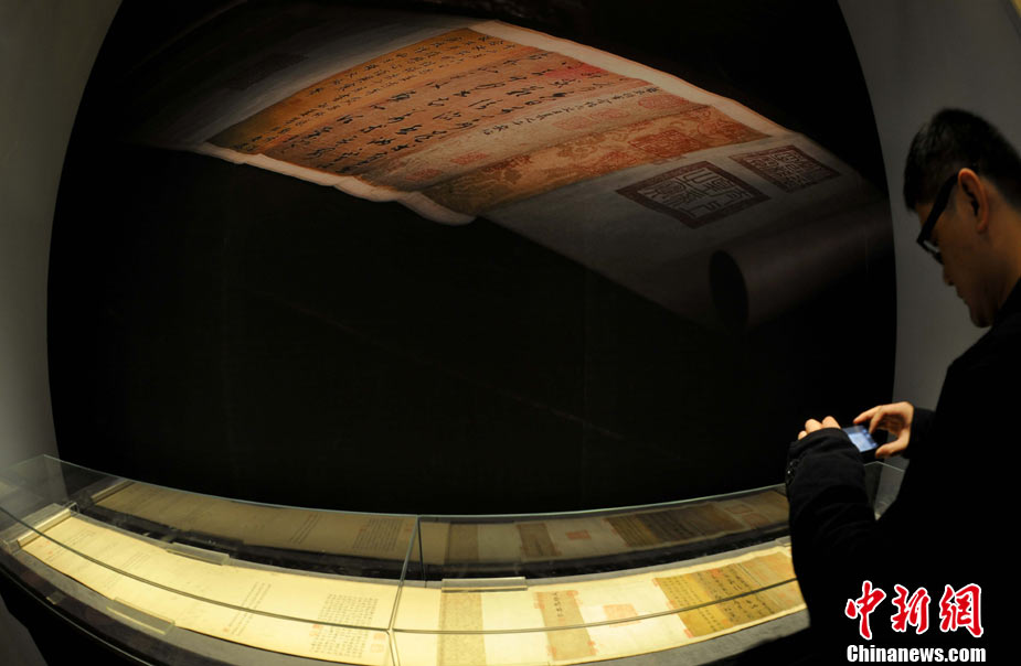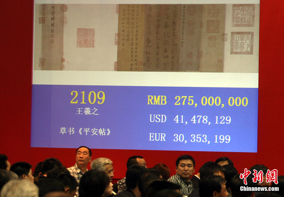 11月20日晚,在中國嘉德2010秋季拍賣會(huì)“秋光萬華——清代宮廷藝術(shù)集粹”專場(chǎng)中,王羲之草書《平安帖》以人民幣三億零八百萬成交。中新社記者 楊可佳 攝