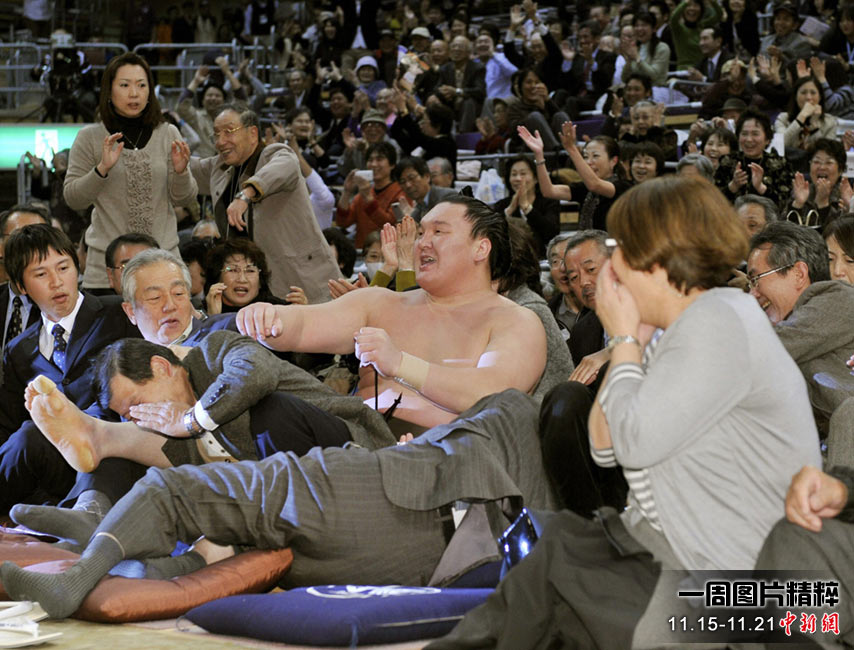 11月15日(周一),日本九州相撲大賽的第二天。圖為來自蒙古的相撲冠軍白鵬翔Hakuho,(圖中)被推出賽臺的一瞬間。
