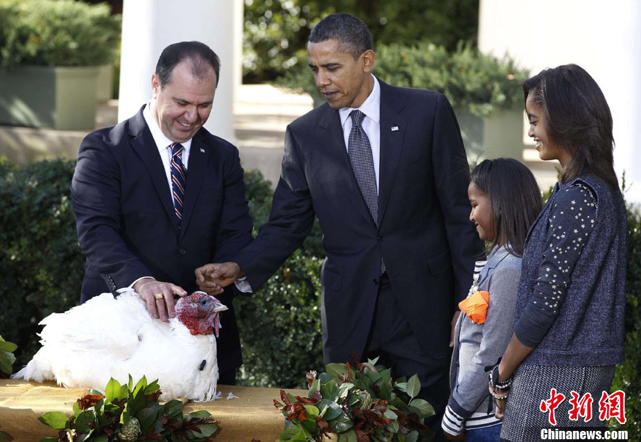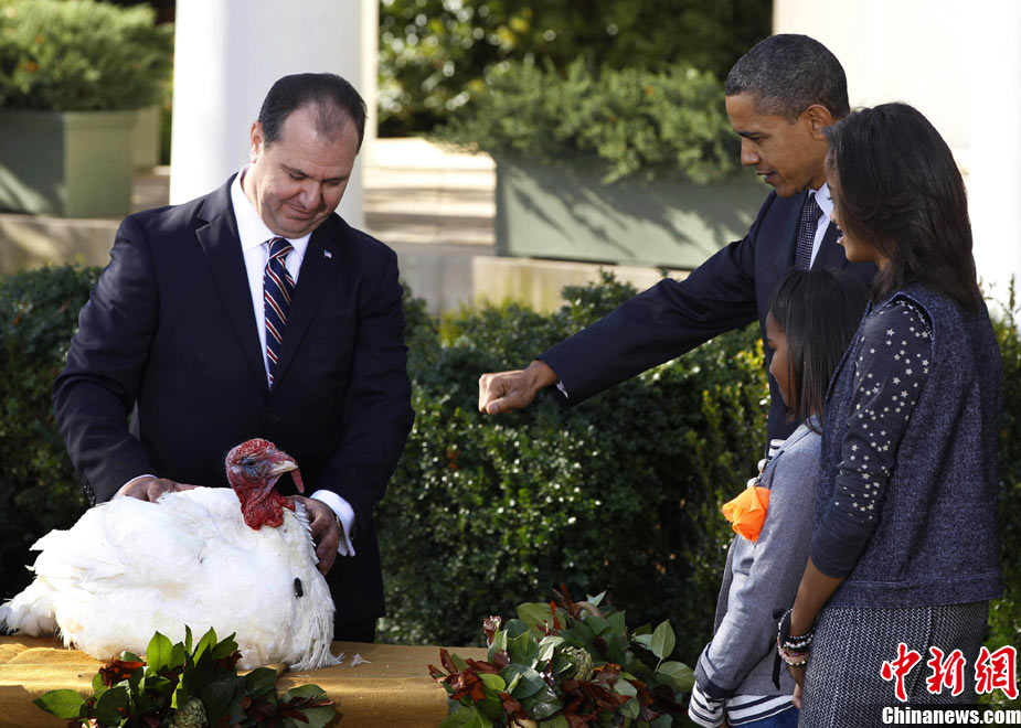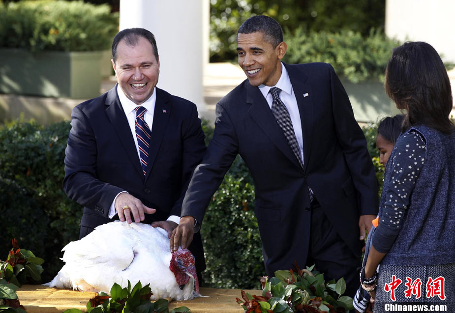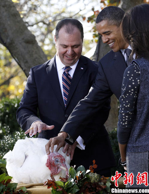 11月24日,兩只分別名叫“蘋果”和“蘋果汁”的加州火雞今天成了全美數(shù)億同類中的幸運兒,在感恩節(jié)前一天,它們得到了“免死金牌”——美國總統(tǒng)奧巴馬依照傳統(tǒng)當天親自赦免了它們。