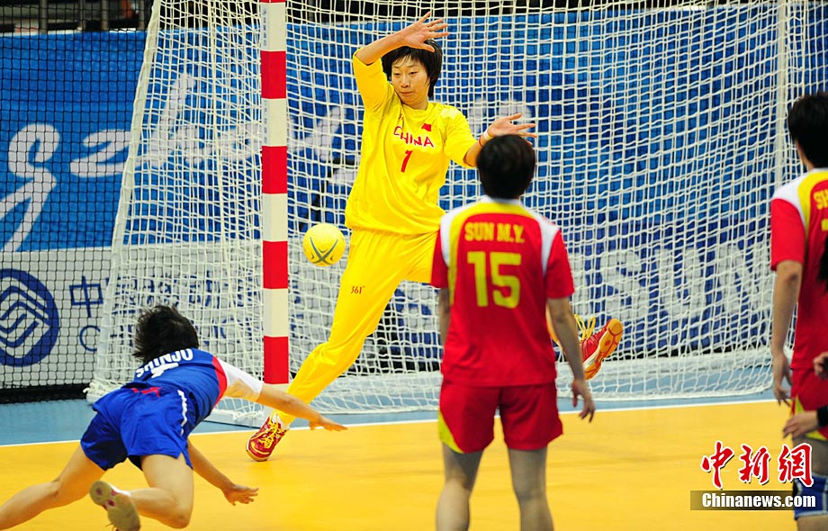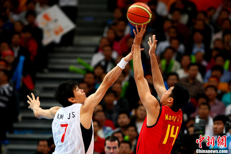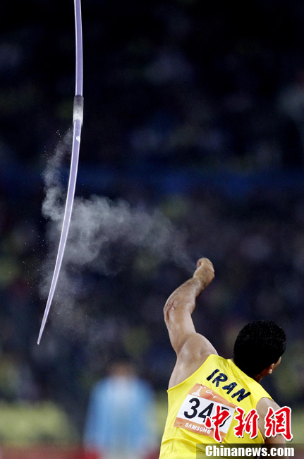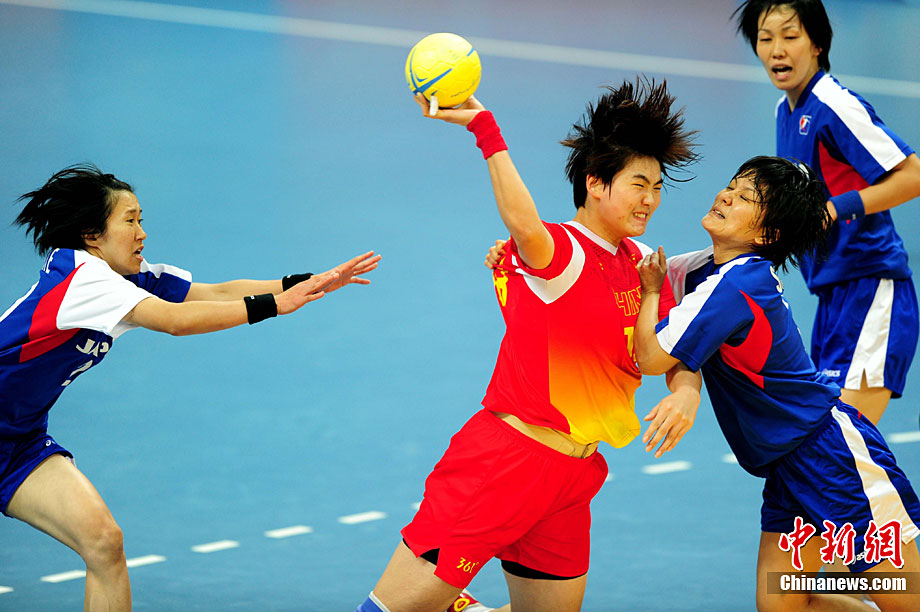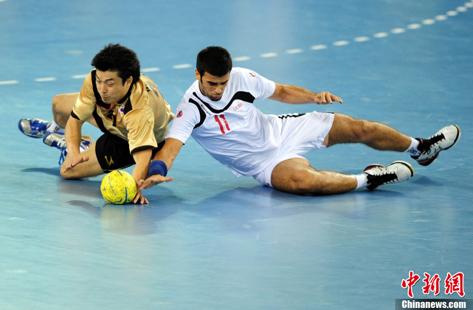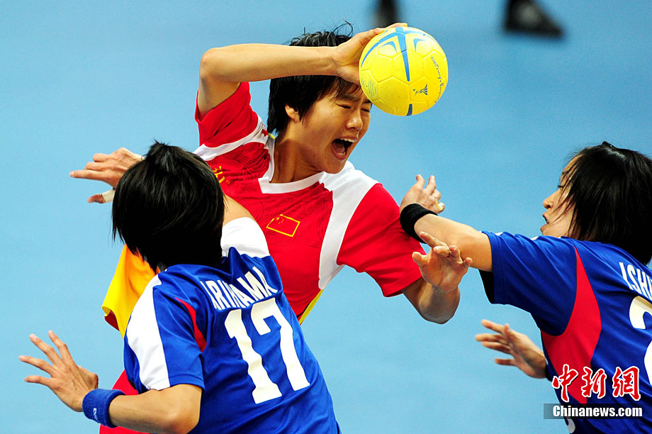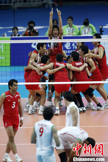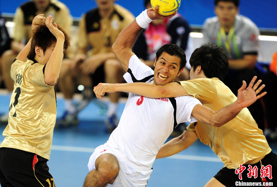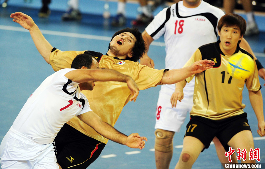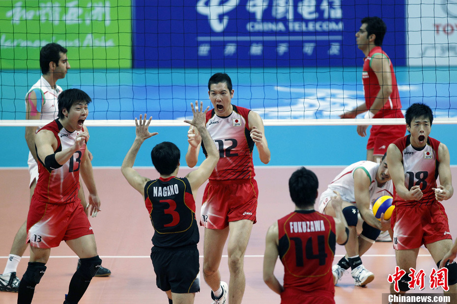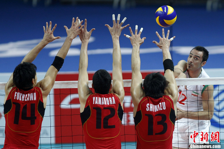 11月26日晚,廣州亞運會男子排球冠亞軍決賽在日本隊和伊朗隊(白)之間展開,最終日本隊3:1戰(zhàn)勝伊朗隊奪得冠軍。圖為日本隊攔截伊朗隊的進攻。中新社記者 盛佳鵬 攝