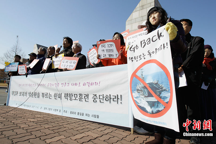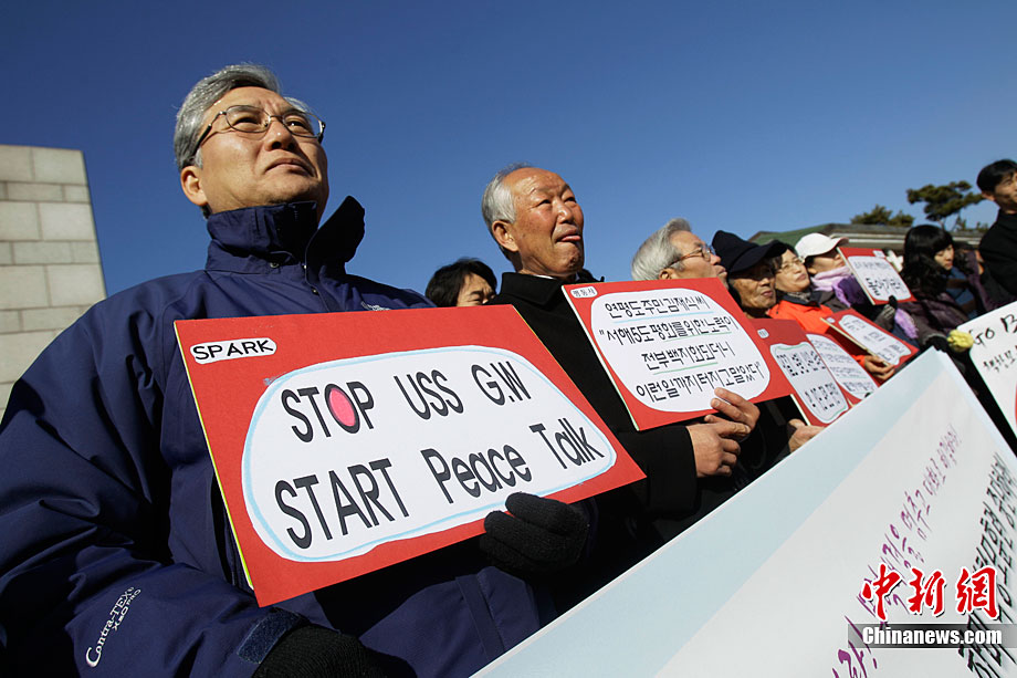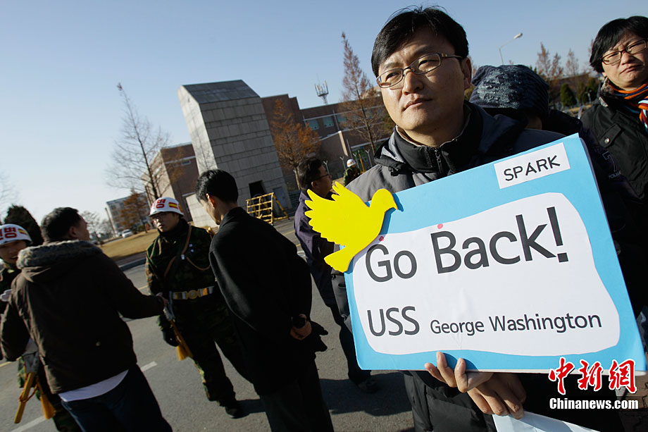 11月28日,韓國民眾在韓國軍事基地前舉行示威游行活動,譴責美國派遣航母參加美韓聯(lián)合軍演。這些民眾表示反對美國“喬治·華盛頓”號航母進入韓國領土,并與韓國軍方舉行軍事演習。