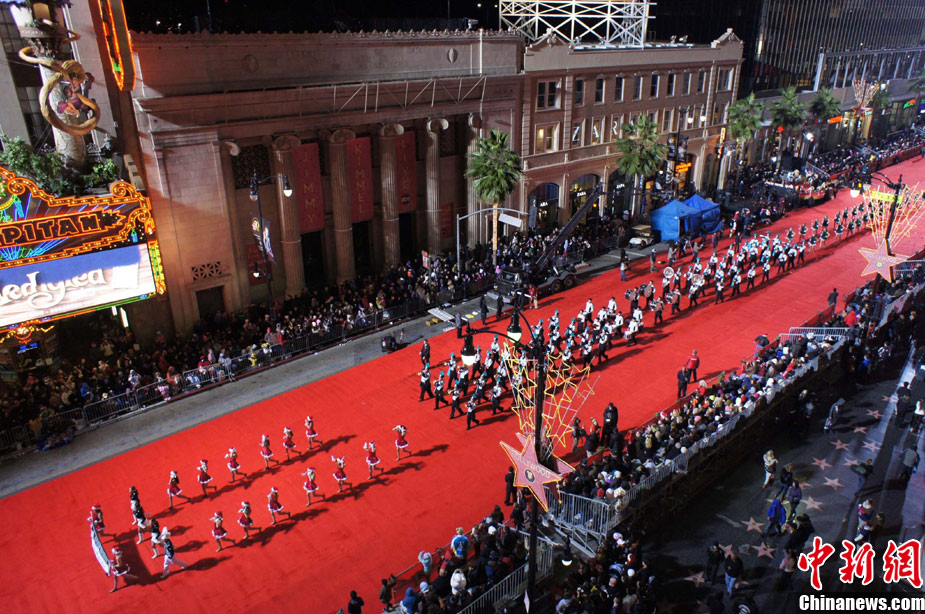11月28日晚,一年一度的好萊塢迎圣誕大游行在好萊塢大道隆重舉行。CNN王牌主播拉里·金擔任今年游行的大禮官,在他的率領下,近60名好萊塢明星和14個樂隊、8個騎馬方陣、巨型充氣卡通、花車等游行隊伍依次通過紅地毯,為洛杉磯迎圣誕活動拉開大幕。好萊塢迎圣誕大游行始于1928年,至今已有80多年歷史。中新社發(fā) 張煒 攝