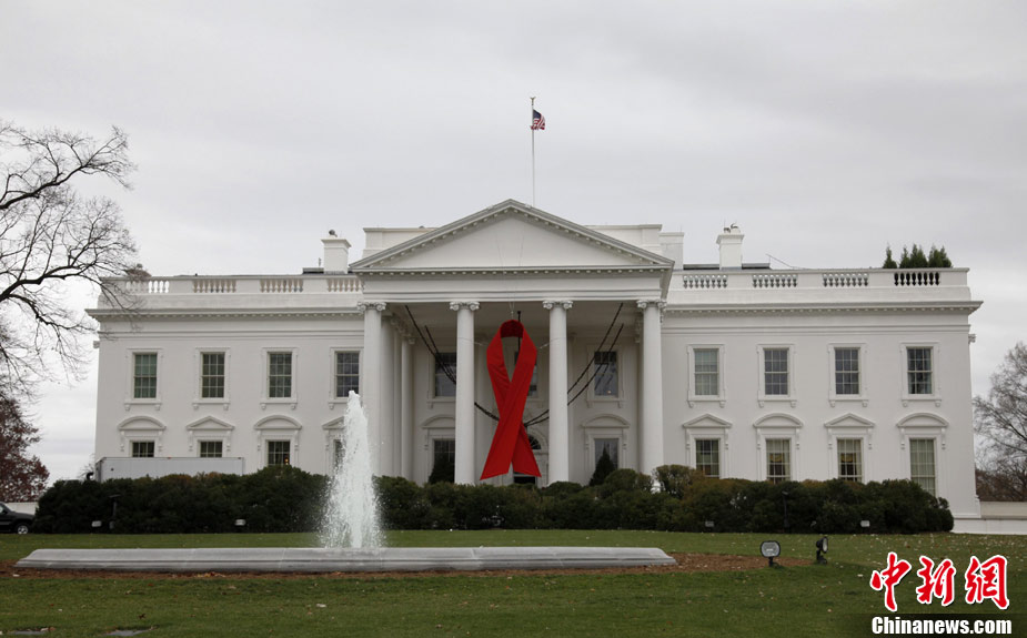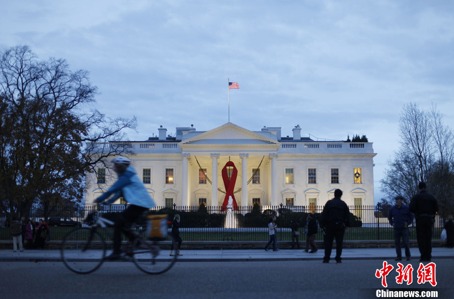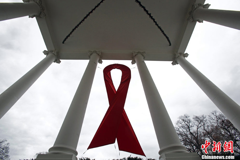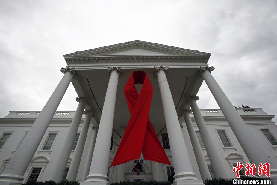 11月30日,為了紀念世界艾滋病日,華盛頓白宮前掛起了一條巨大的紅絲帶。