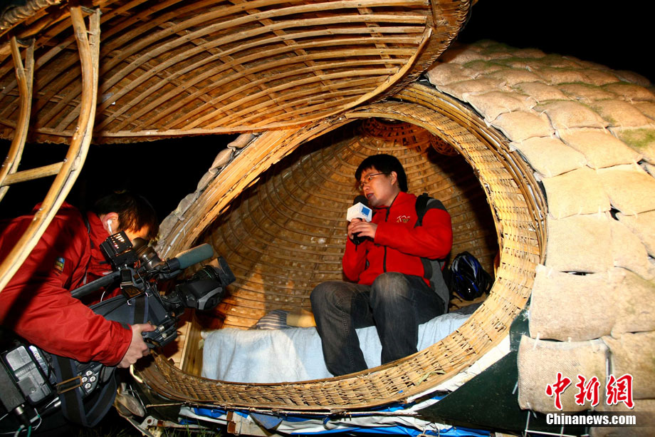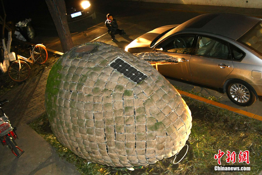 近日,來自湖南的24歲青年戴海飛在北京市海淀區(qū)成府路的一個大院里,搭起一個“蛋形”小屋,作為自己的蝸居。小屋兩米多高,“蛋殼”上有一個橢圓形的小門,沒有鎖。小屋的下邊裝有輪子,可以挪動。小屋引起了多家媒體的高度關注,2日深夜有大批的記者來到小屋采訪,而戴海飛卻不知因何一直沒有露面,直到深夜11點多,也沒有回到小屋。中新社記者 富田 攝