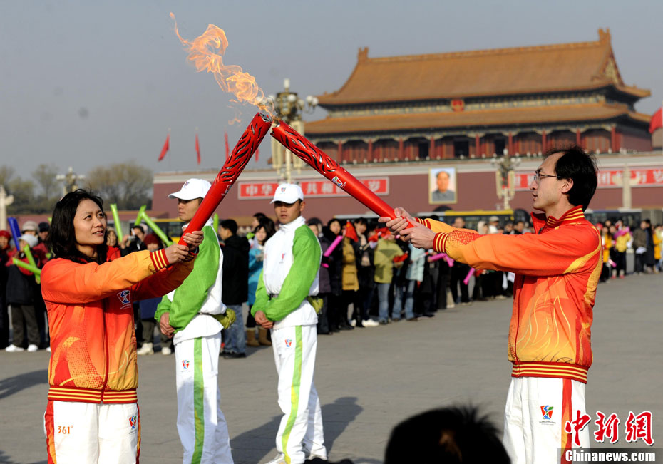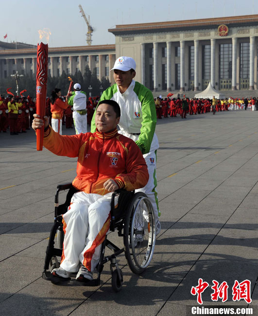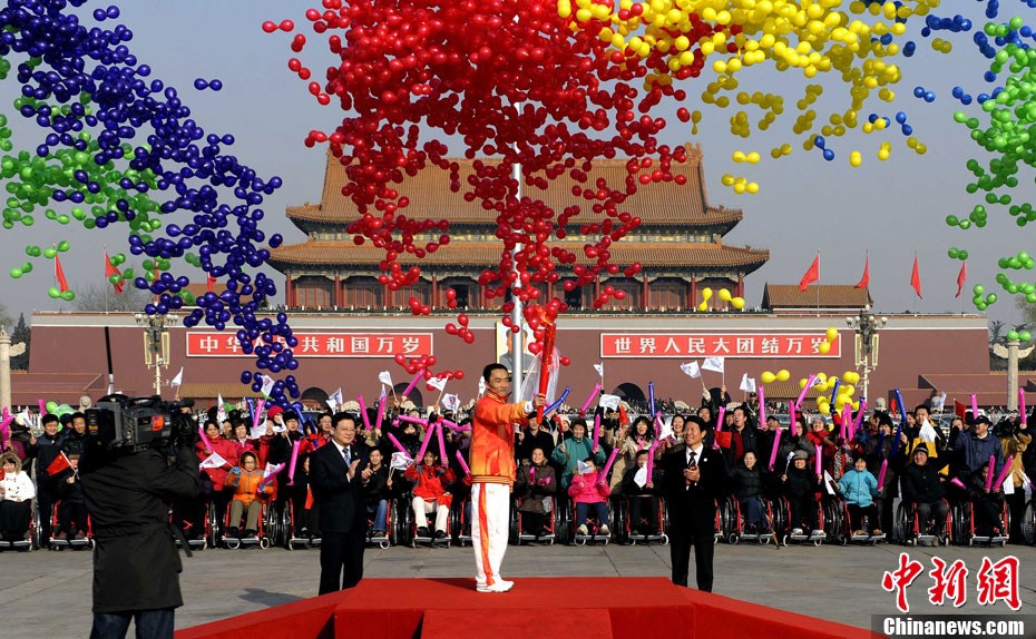 12月4日10時(shí)整,廣州2010年亞洲殘疾人運(yùn)動(dòng)會(huì)火炬點(diǎn)燃暨火炬?zhèn)鬟f活動(dòng)在北京人民大會(huì)堂北大廳啟動(dòng)。北京站傳遞活動(dòng)有20棒火炬手,整個(gè)火炬?zhèn)鬟f活動(dòng)圍繞天安門廣場(chǎng)北廣場(chǎng)進(jìn)行。中新社記者 劉震 攝