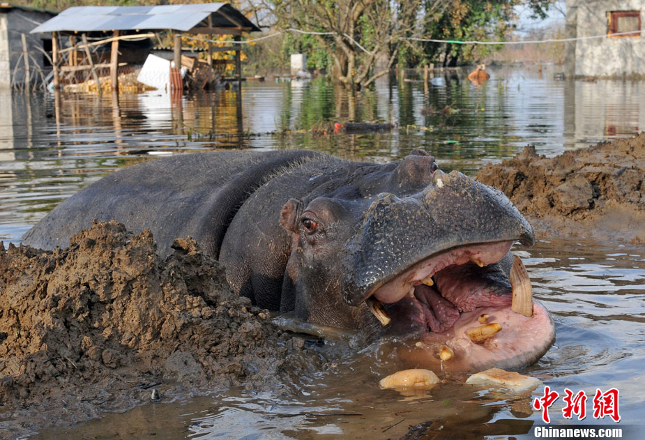 巴爾干半島西部連日來頻遭大雨侵襲,造成波斯尼亞和黑塞哥維那、塞爾維亞、黑山和阿爾巴尼亞的許多地區(qū)洪水泛濫,數(shù)千人被迫撤離家園。圖為6日,在黑山的普拉夫尼察,一頭從動物園中逃出的河馬在洪水中游泳。