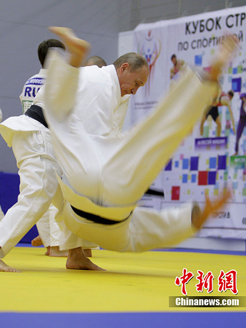 當?shù)貢r間12月22日,俄羅斯總理普京來到圣彼得堡視察了一家柔道俱樂部,并參加了該俱樂部內(nèi)的一堂柔道訓練課。圖為普京正在與運動員切磋柔道。