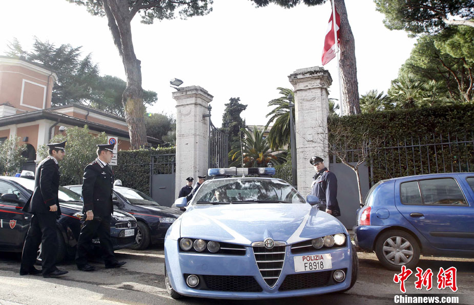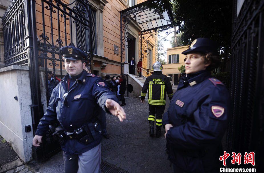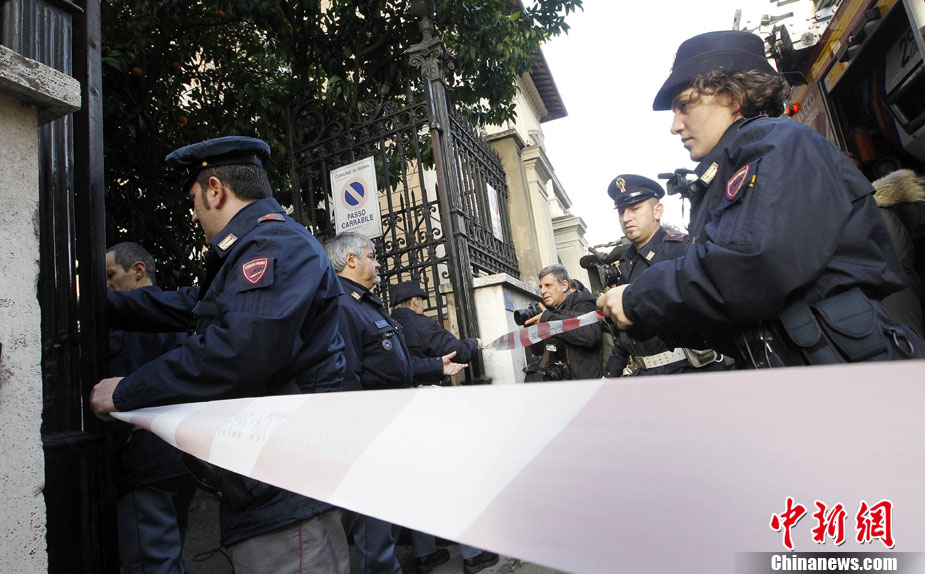 瑞士駐意大利使館一名職員當天在拆開一個郵包時,郵包發(fā)生爆炸,該工作人員雙手嚴重受傷,目前正在醫(yī)院接受治療。時隔不久,智利駐意大利使館也發(fā)生郵包爆炸事件,一名工作人員受傷,所幸沒有生命危險。圖為在智利大使館前警方拉起了警戒線。