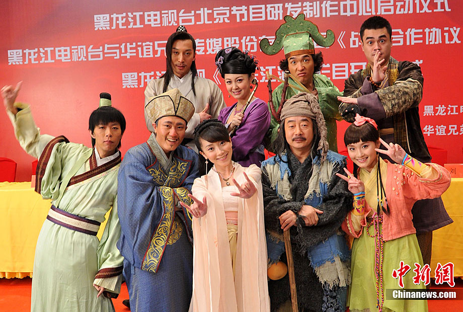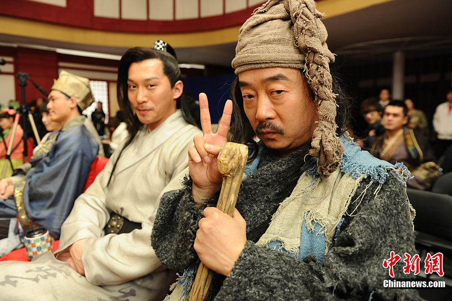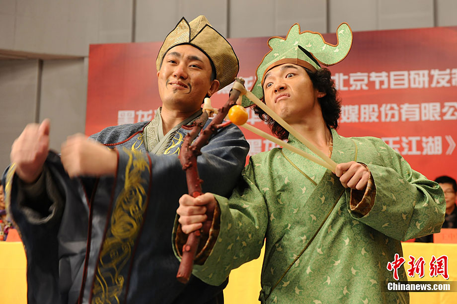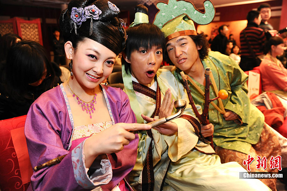 12月28日,古裝娛樂欄目劇《快樂江湖》在黑龍江電視臺北京節(jié)目研發(fā)制作中心正式開機(jī)。該劇由黑龍江電視臺與華誼兄弟聯(lián)手打造,講述了幾個現(xiàn)代人“穿越”到唐代的無厘頭爆笑故事。圖為劇中的“無厘頭”演員團(tuán)隊(duì)。中新社記者 李學(xué)仕 攝
