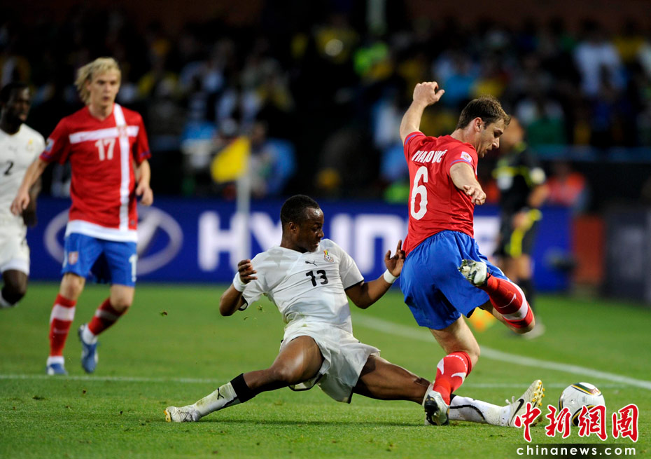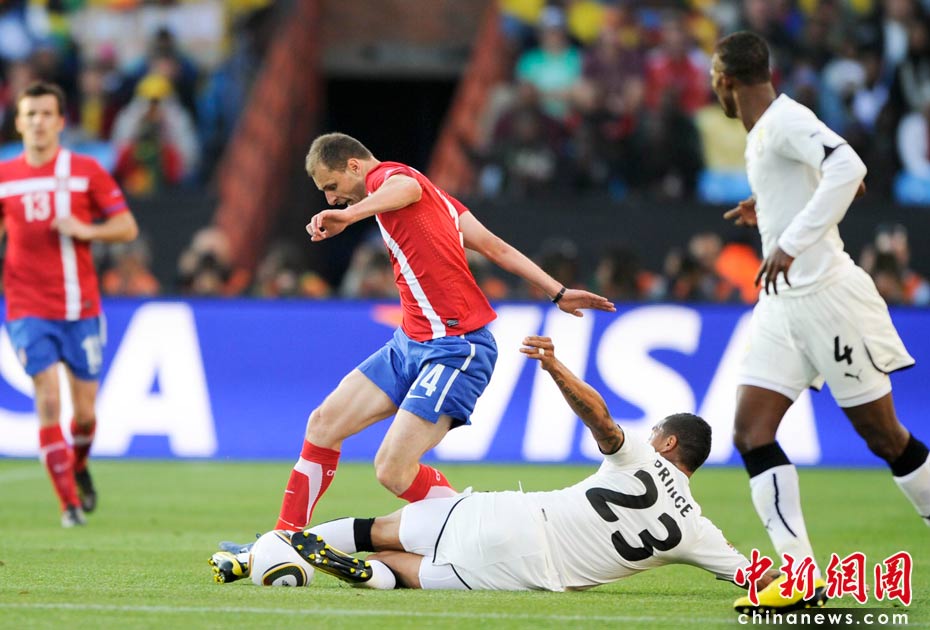 6月13日,南非世界杯D組小組賽在比勒陀利亞洛夫托斯球場(chǎng)舉行,在上半場(chǎng)比賽中塞爾維亞與加納隊(duì)展開激烈爭(zhēng)奪。 中新社記者 廖攀 攝