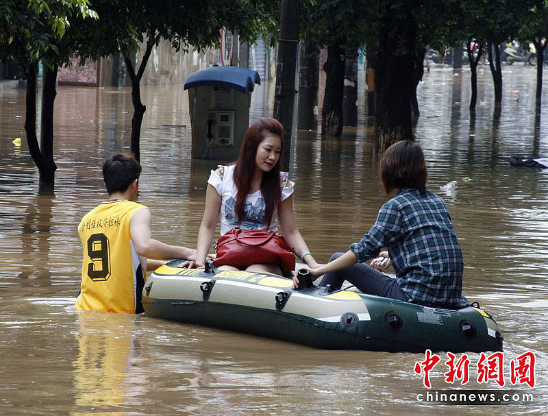 2010年6月17日,廣西桂林市出現(xiàn)大到暴雨、局部大暴雨天氣。漓江洪水倒流入市區(qū),市民坐竹排出行。東華/CFP