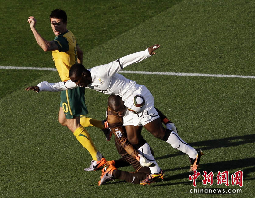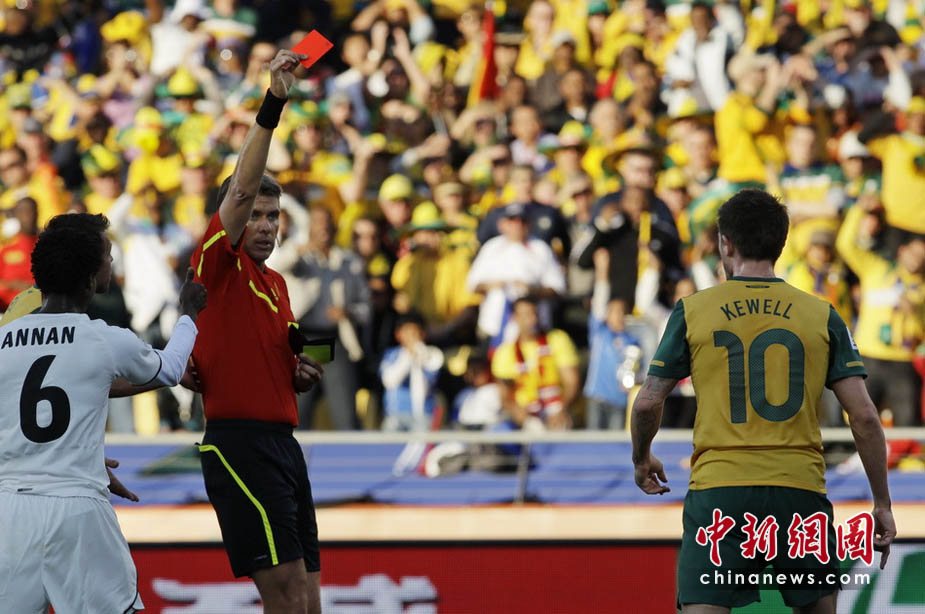 6月19日,世界杯D組第2輪一場小組賽在勒斯騰堡的皇家班佛肯球場展開,加納隊迎戰(zhàn)澳大利亞隊。最終被罰下一人的澳大利亞隊1比1逼平加納。