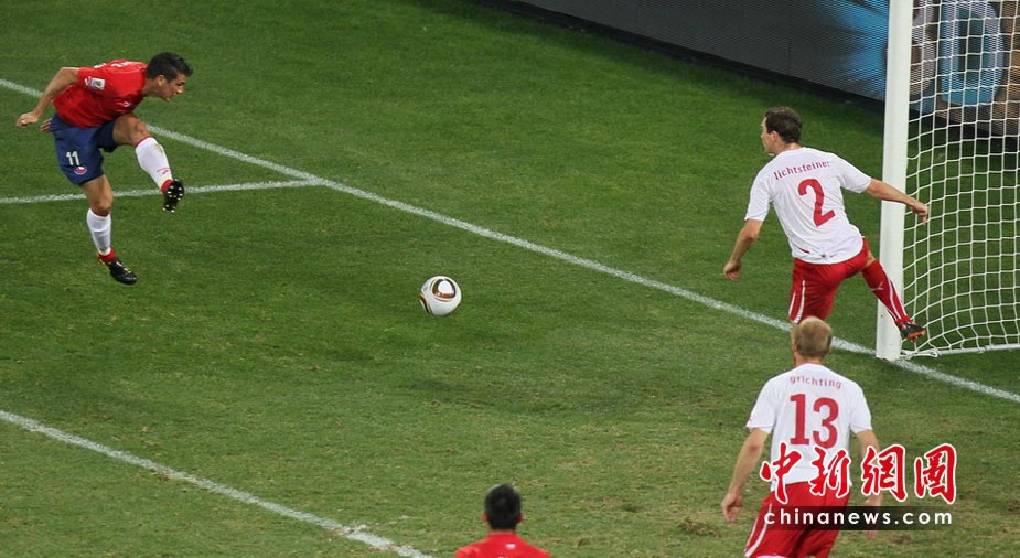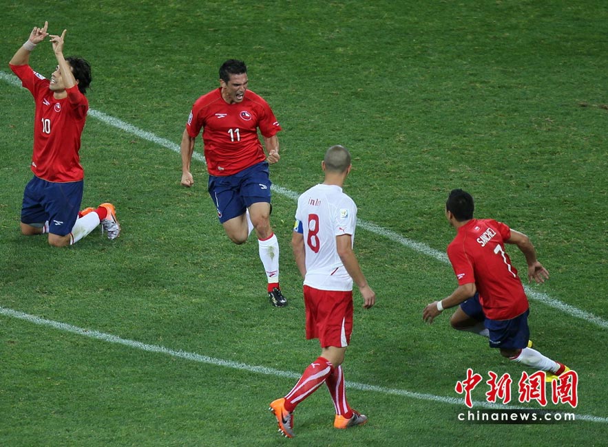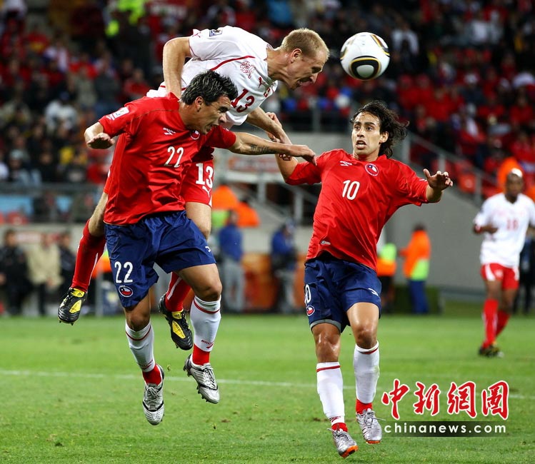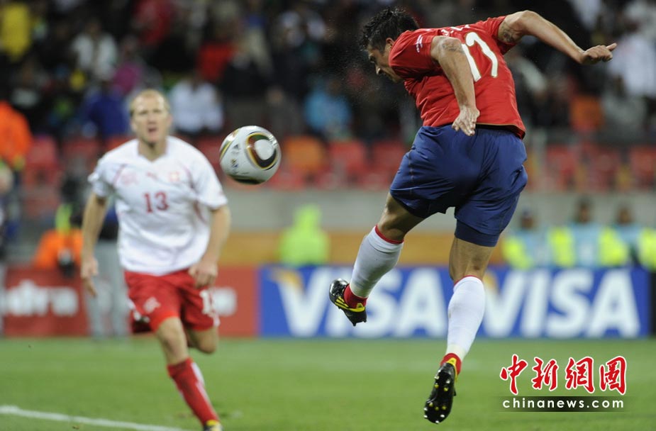 6月21日,世界杯H組第2輪首戰(zhàn)在伊麗莎白港納爾遜-曼德拉灣球場展開較量。瑞士中場貝赫拉米連續(xù)肘擊兩人,被紅牌罰下后,以十人應戰(zhàn)的他們在下半場被智利隊岡薩雷斯打入一球,以0-1告負。
