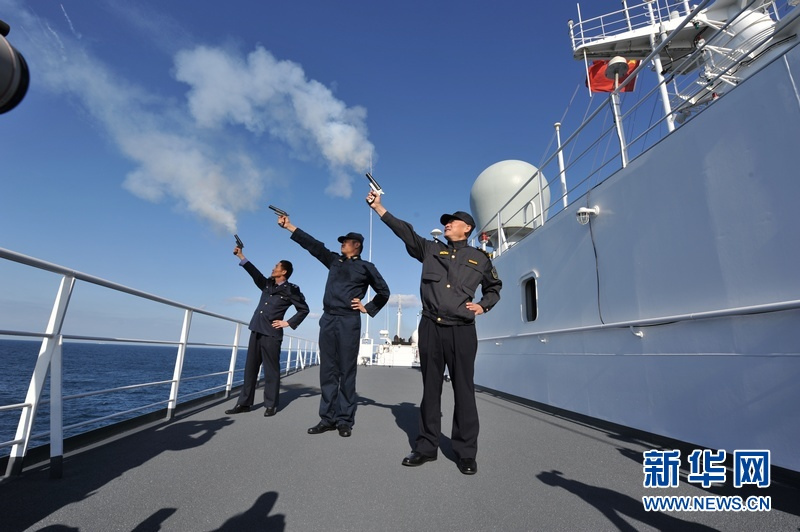 海軍、海監(jiān)、漁政部門人員共同發(fā)射信號彈。“東海協(xié)作—2012演習”軍地海上聯(lián)合維權演習正式開始。虞起正 攝