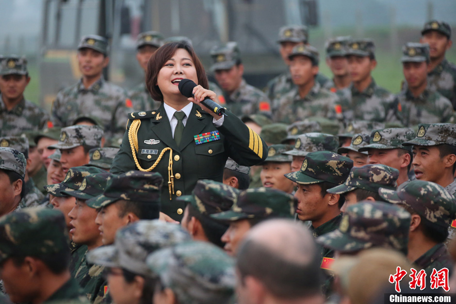 8月10日,隨同中方參演部隊(duì)赴俄羅斯參加“和平使命-2013”中俄聯(lián)演的沈陽(yáng)軍區(qū)政治部文工團(tuán)演員們,為中俄千余名參演官兵獻(xiàn)上了一場(chǎng)精彩的文藝晚會(huì)。豐富多彩的文藝節(jié)目,將位于切巴爾庫(kù)爾訓(xùn)練場(chǎng)的中俄聯(lián)演野營(yíng)村,變成了友誼的盛會(huì)、歡樂的海洋。 圖為演唱歌曲《當(dāng)那一天來臨》。中新社發(fā) 李祥輝 攝
