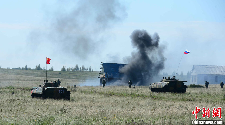 8月12日12時(北京時間下午2時),“和平使命-2013”中俄聯(lián)合反恐軍事演習,在俄羅斯切巴爾庫爾合同訓練場進行了實兵實彈協(xié)同訓練。圖為中俄雙方參演官兵共同向前推進清剿殘敵。中新社發(fā) 譚長俊 攝