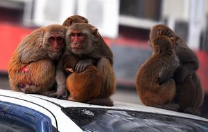 猴子聚堆爬車頂取暖