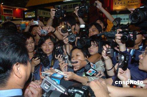 十月十八日,眾多媒體記者在威尼斯人會展中心舉行的第十二屆澳門國際貿(mào)易投資展覽會(MIF)上,爭搶采訪某省的負(fù)責(zé)人。規(guī)模宏大,盛況空前的第十二屆澳門國際貿(mào)易投資展覽會(MIF),以努力打造成國際貿(mào)易平臺為己任,引起了新聞媒體的極大關(guān)注。中新社發(fā) 史利 攝