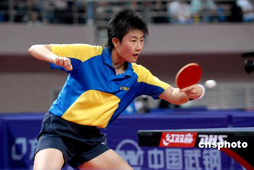2007年10月26日,第六屆全國(guó)城市運(yùn)動(dòng)會(huì)乒乓球女子單打決賽在武漢洪山體育館舉行。繼半決賽擊敗世乒賽女單冠軍郭躍后,成都市代表隊(duì)小將丁寧奮力拼博,又以4:2力克另一名世界名將、濟(jì)南市代表隊(duì)的李曉霞,獲乒乓球女子單打冠軍,摘取了“六城會(huì)”女子乒乓球單打決賽金牌。中新社發(fā) 楚天行 攝