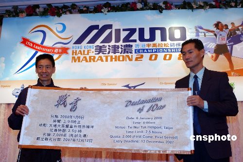 11月30日,香港資深長跑好手李嘉綸(左)代表參賽跑手,從香港田徑總會(huì)長跑部主委王劍麟手中接過參賽戰(zhàn)書。香港業(yè)余田徑總會(huì)當(dāng)日宣布,一年一度的香港半馬拉松錦標(biāo)賽將于2008年1月6日舉行。中新社發(fā) 蔡蔓莉 攝