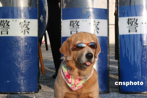 十二月六日,臺(tái)北“中正紀(jì)念館”在爭(zhēng)議聲中開始封館,“大中至正”牌樓將要拆除。圖為一只被主人戴上墨鏡的狗站在警察人墻前,成為媒體拍照“明星”。中新社發(fā) 董會(huì)峰 攝