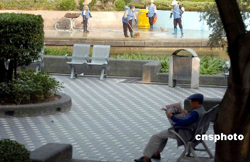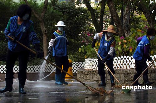 12月7日早上,香港康文署人員在屯門公園以清水開釋消毒藥水清洗場地。半個月內(nèi),屯門公園在同一地點發(fā)現(xiàn)有雀鳥確診或懷疑帶有禽流感病毒。中新社發(fā) 譚達明 攝