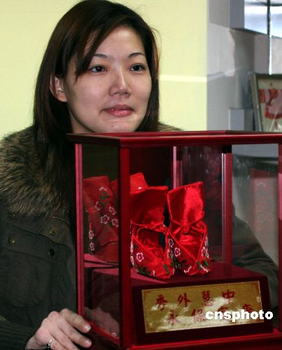 一月三日,一個(gè)名為“絕代三寸,風(fēng)華金蓮”——臺灣人與三寸金蓮的展覽在臺灣故事館展出。目的在于讓民眾通過了解三寸金蓮鞋產(chǎn)生的歷史和演變,進(jìn)而了解曾流行于大陸和臺灣的纏足文化。展覽共展出由臺北縣土城廣川醫(yī)院院長,也是三寸金蓮文物館館長的柯基生收集的三寸金蓮鞋真品四十六件。圖為工作人員正在向觀眾展示臺灣婦女曾穿過的三寸金蓮鞋。中新社發(fā) 陳立宇 攝