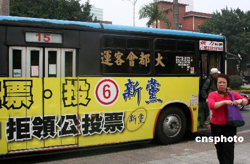 圖:臺(tái)公交車上刊登新黨“拒領(lǐng)公投票”廣告
