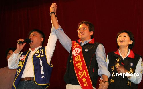 一月十日晚,臺北市市長郝龍斌參加“立委”候選人周守訓(xùn)拉票造勢晚會,為周參選站臺、打氣。臺灣“立委”選舉在即,選戰(zhàn)已進(jìn)入白熱化。中新社發(fā) 孫自法 攝