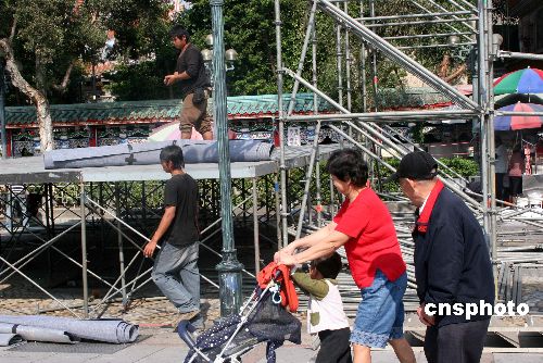 一月十一日,距臺灣“立委”選舉投票日只有一天。從中午開始,臺北市龍山寺前,工人在趕搭臨時舞臺,準備供候選人晚上造勢,作最后沖刺。中新社發(fā) 陳立宇 攝