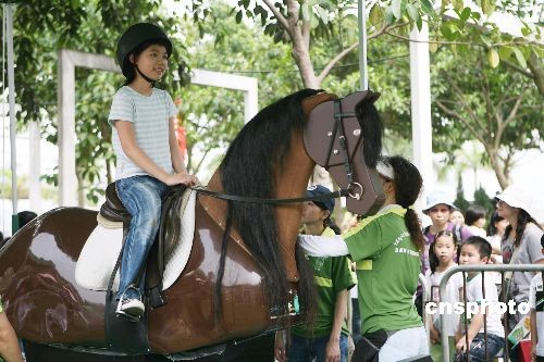四月六日,香港大埔海濱公園舉行大埔迎奧運(yùn)嘉年華,向市民宣揚(yáng)奧運(yùn)精神,并加深對(duì)香港協(xié)辦的奧運(yùn)馬術(shù)項(xiàng)目的認(rèn)識(shí)與熱愛(ài),中國(guó)香港體育協(xié)會(huì)暨奧林匹克委員會(huì)會(huì)長(zhǎng)霍震霆、香港民政事務(wù)局局長(zhǎng)曾德成等出席活動(dòng)。圖為小朋友通過(guò)試騎電動(dòng)馬體驗(yàn)馬術(shù)。 中新社發(fā) 武仲林 攝